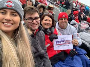 Again, great seats! The weather wasn't as bad as predicted, but still cold. It was a nail biter, but the Buckeyes pulled it out. Thank you for the ticket donation. It means alot to be able to go to The Ohio State games.