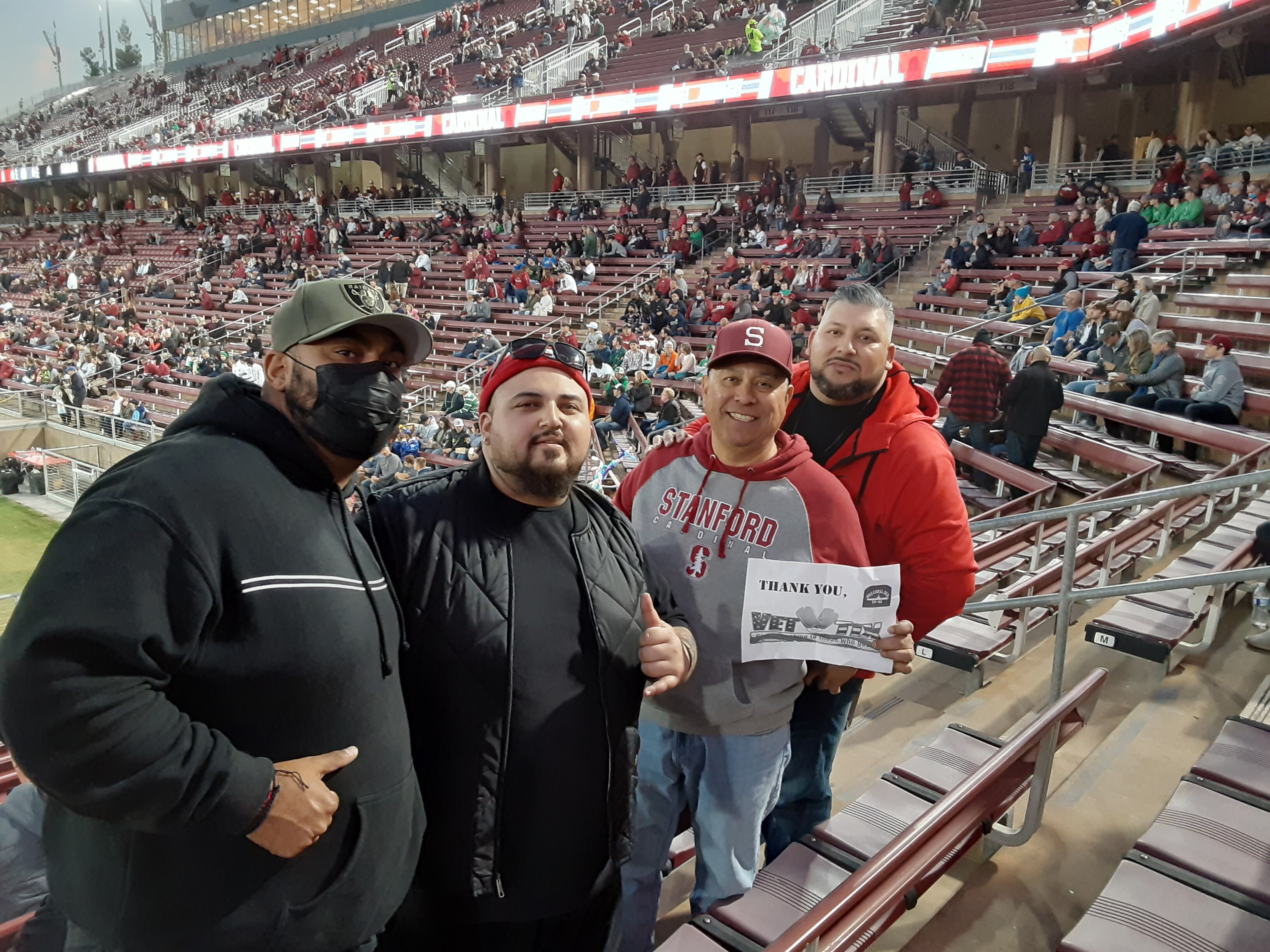 Thank you for the great seats to the Stanford game! My friends and Family had a great time and will remember this event for years to come!