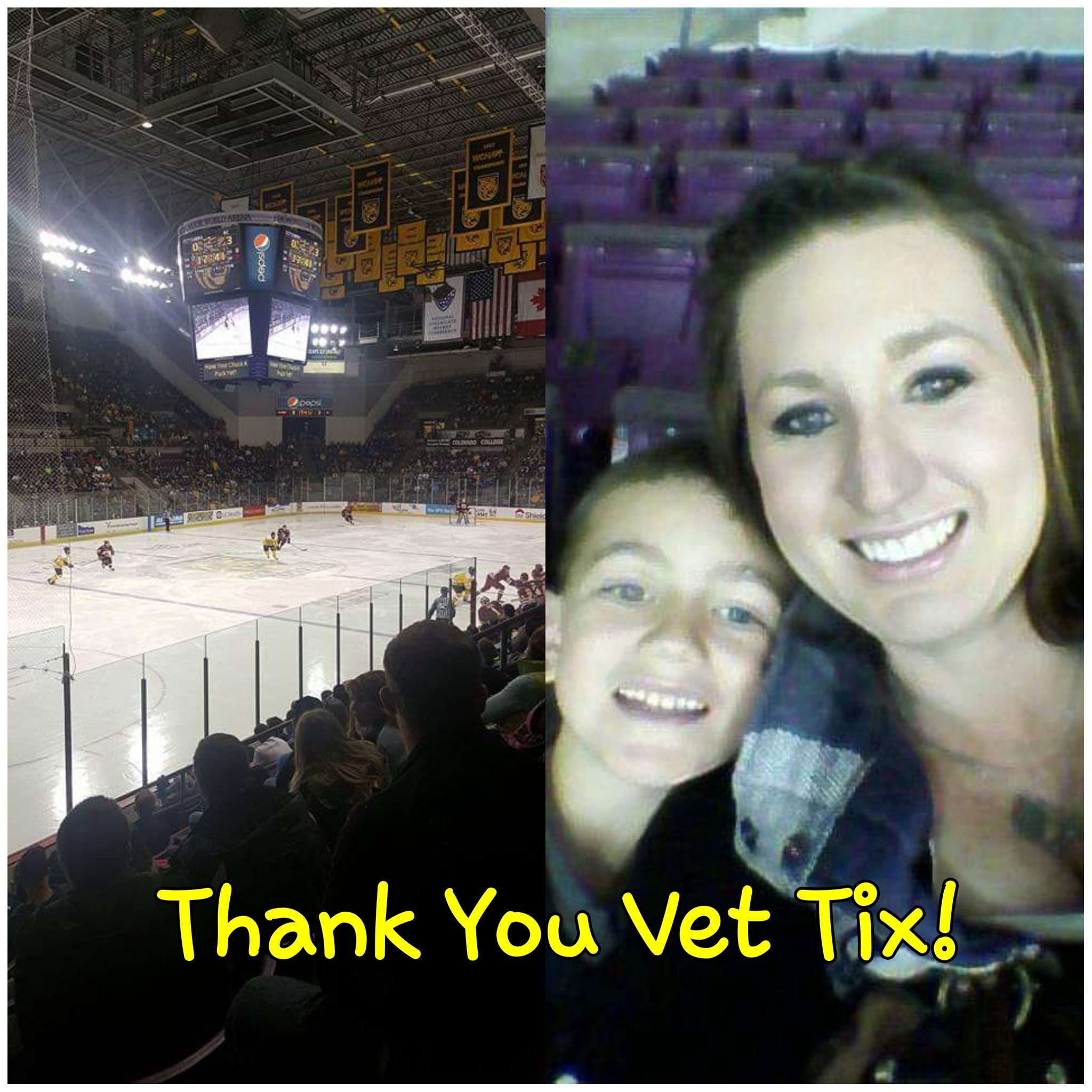 A big thank you to Colorado College Hockey-NCAA and VetTix for allowing my family to this first ever hockey game. Your donation was a great experience for my daughters and I. The seats were great and the ambiance even better! We look forward to following CC Tiger's and hopefully attending more games. We appreciate all you do for our Veterans and their family.