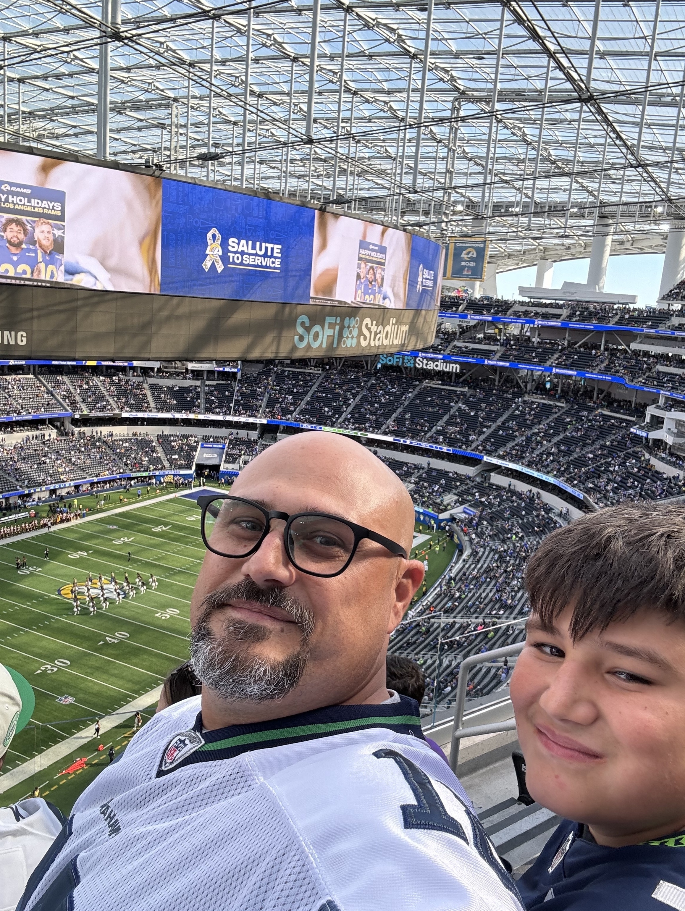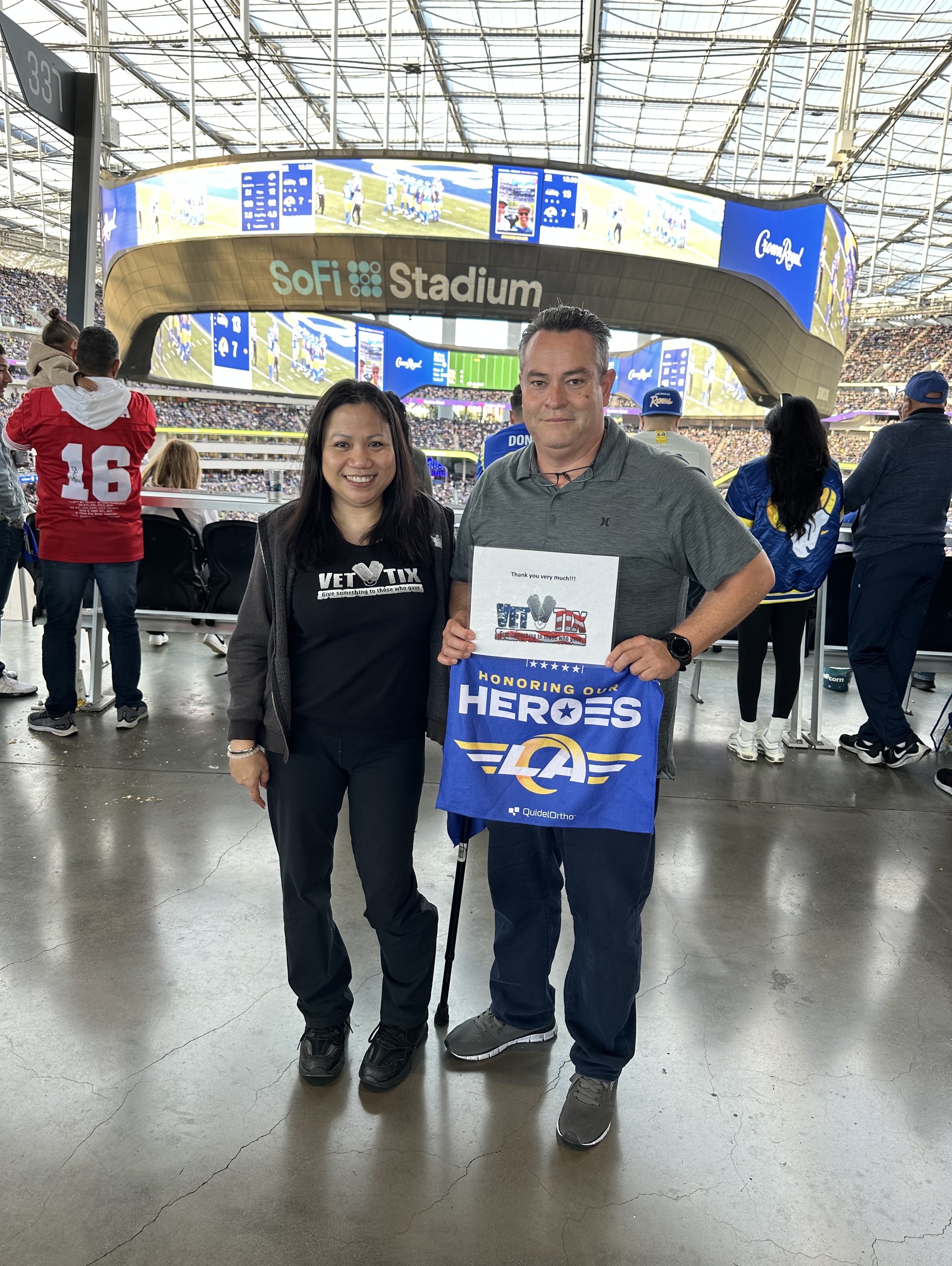 WOW! I’m still on a high from this game, what a thriller! I’m a longtime Rams fan and really enjoyed being at SoFi watching them win again. A huge thank you to all the donors that allowed me this fantastic opportunity to attend the game. Thank you Clint N, Angeline S, Ramon R, John P, Blayne Y, Phillip P, Patrick R, Belinda r L, Daniel V, George A, Scott K, Tiffany T, Alvin L, Hannah H, Nicolette L, Lisa F, Nicole M, Jack C, Kevin D, Jamie M, Edward M, John L, William D, Tim A. Your generosity is so very much appreciated by this Navy Veteran.