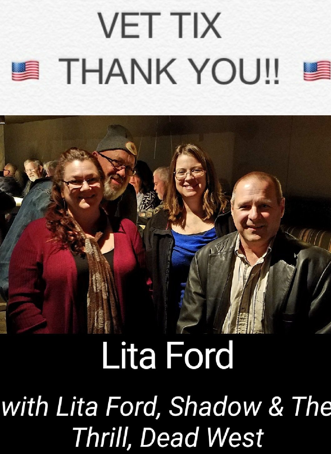 Thank you BLK Live and VETTIX for making an evening of great memories !! Got too see Lita Ford at this awesome venue . Had a blast and wonderful time jamming out and hanging with a lot of great people . Wouldn't be able too attend this event on my own so once again thank you very much for your donations!! It's greatly appreciated!!!