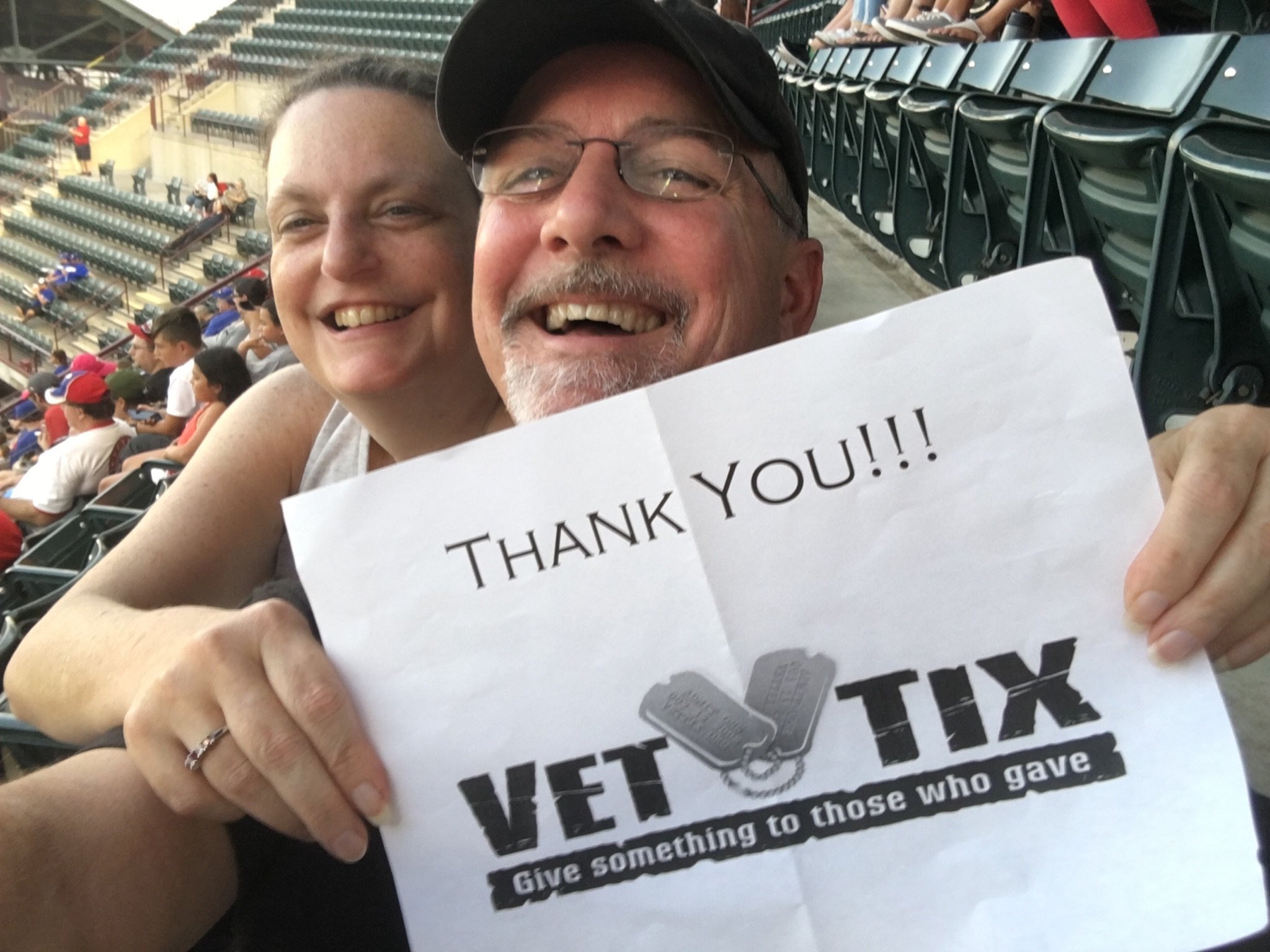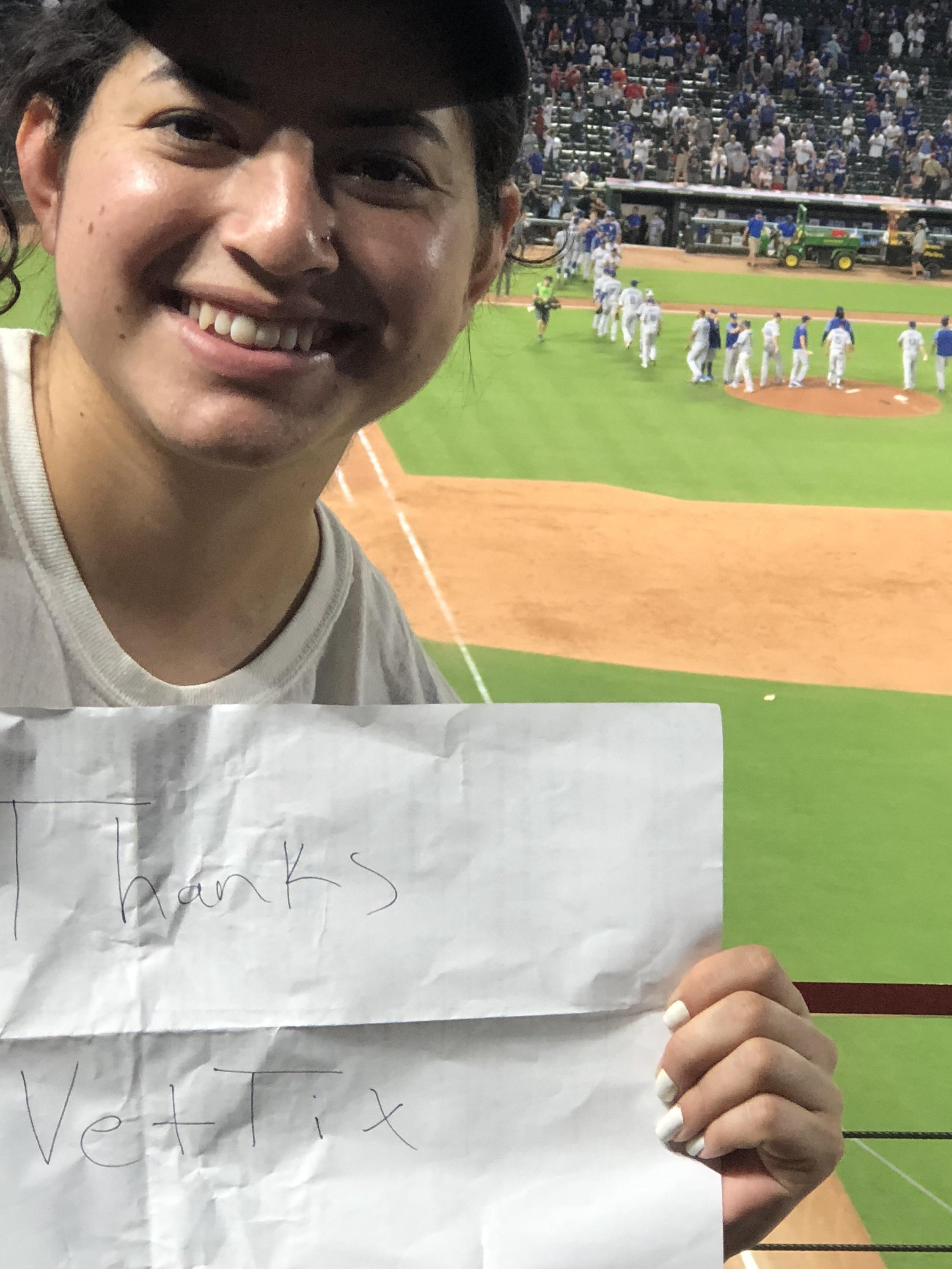 Thank you Vettix and Texas Rangers - MLB!!! This was our first MLB game and it was truly a wonderful experience because of you. When I was a little girl, I used to watch baseball with my grandfather who was also a veteran. He is the one who inspired me to join the military. Being at this game brought back all the good times we used to have. I am very grateful for the tickets. Thank you very much! -Dawn