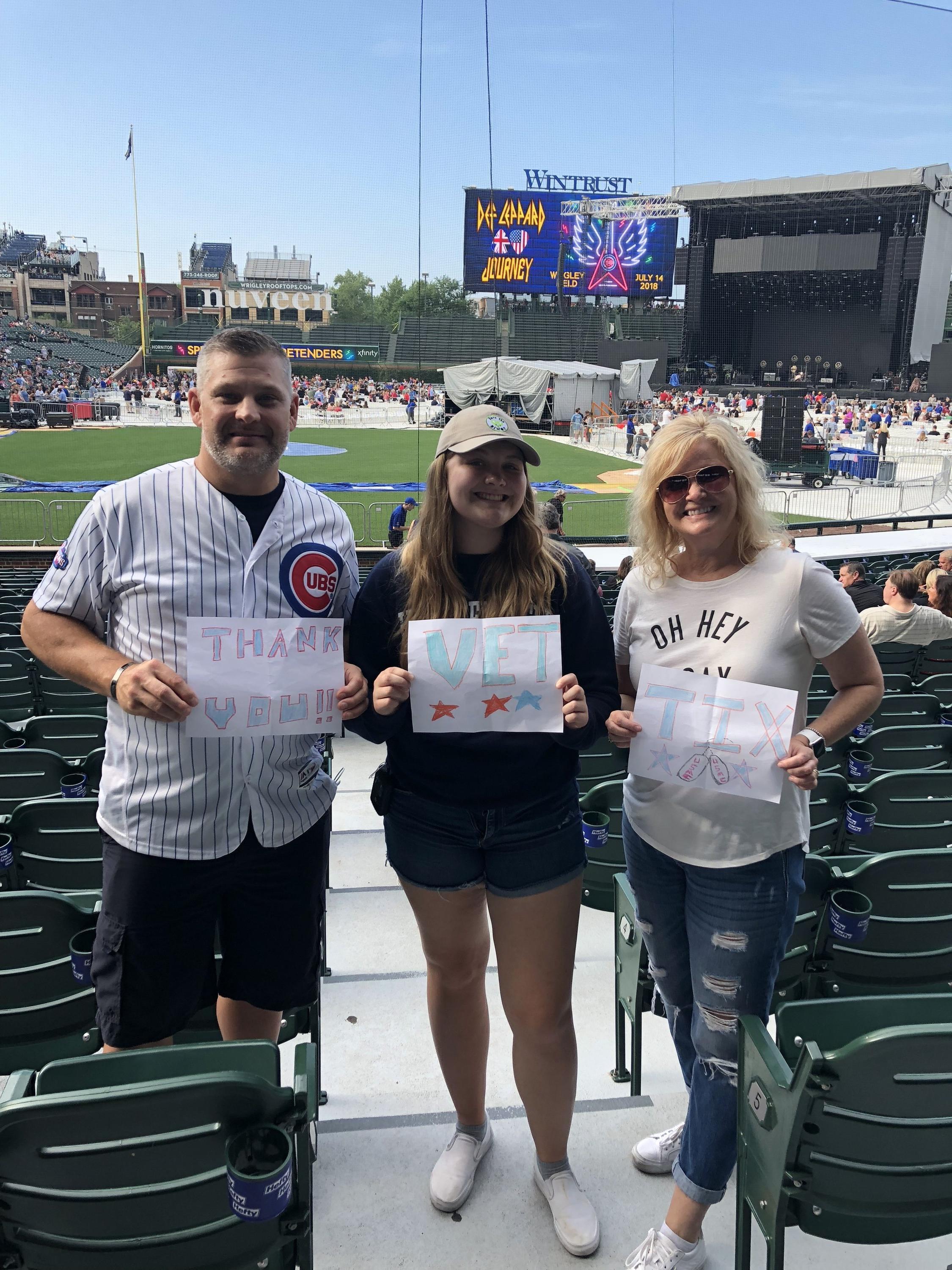 Thank you so much to Live Nation for their generous donation. We had an amazing time at the concert. This was our first time seeing a concert at Wrigley Field. The atmosphere was amazing! Def Leppard was awesome as well!!!! Thank you to Live Nation and Vet Tix for the service that you are providing veterans and service members! Ron Brehmer