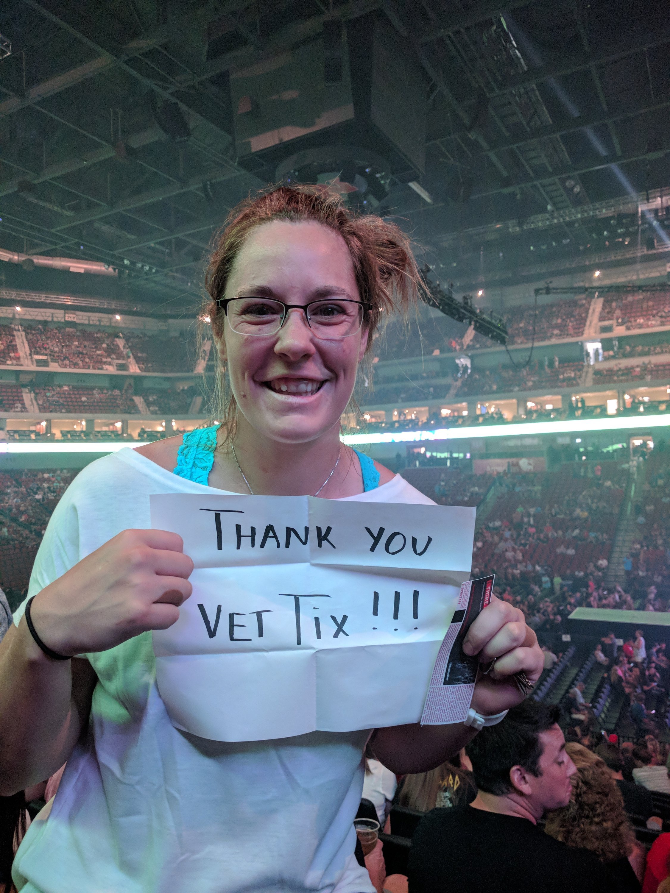VetTix and Live Nation, I wanted to say thank you so very much for the tickets to the Journey and Def Leppard concert last night in Lincoln, NE. This was the first concert that I have ever been to, and it could not have been more fun! Furthermore, after taking the picture attached, a gentleman sitting next to me struck up a conversation; he is a veteran himself, and he had much sage advice to give regarding my upcoming first assignment at a base at which he had previously served. So, in addition to the incredible concert, I wanted to also say thank you for helping to make a meaningful connection! I am so grateful for your donation of tickets. As a young grad student just entering the military, I certainly could not have afforded to attend this concert as a last HOORAH prior to beginning my military service. V/r, Christina