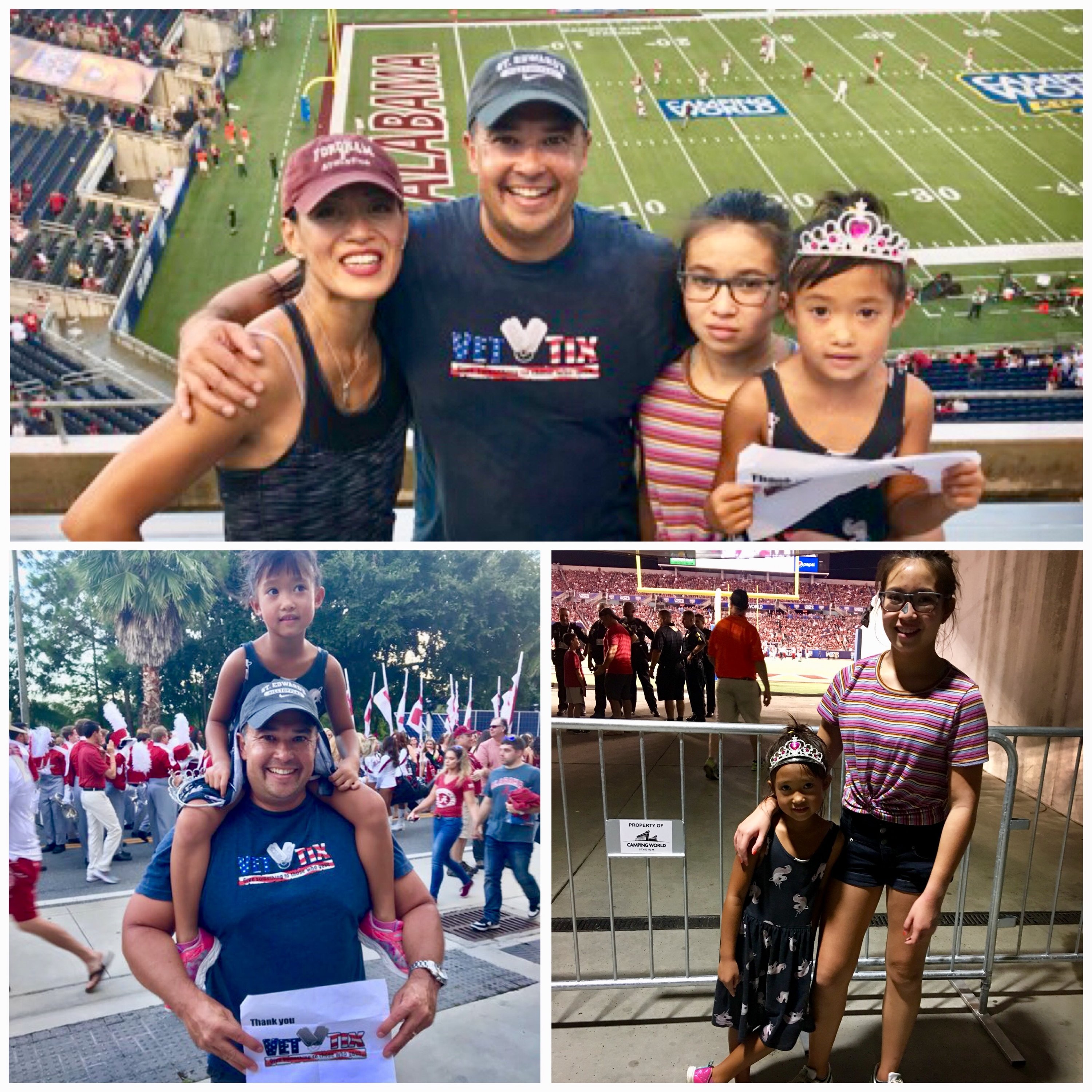 We would like to pass on our gratitude to Florida Citrus Sports for donating to Vet Tix. Their donation allowed our family to experience its first college football game and fulfill a lifelong dream of seeing Alabama play live. The Long Family