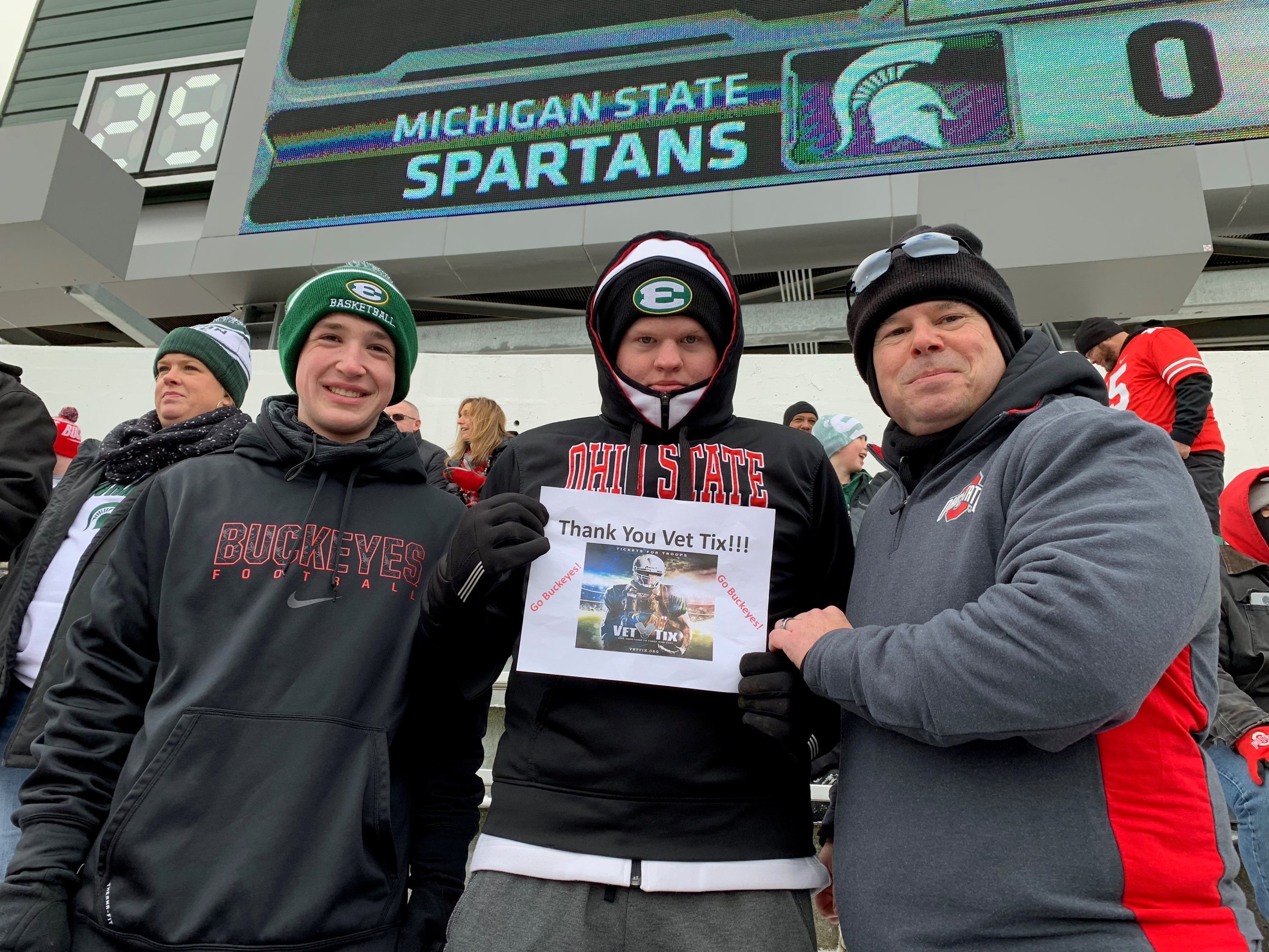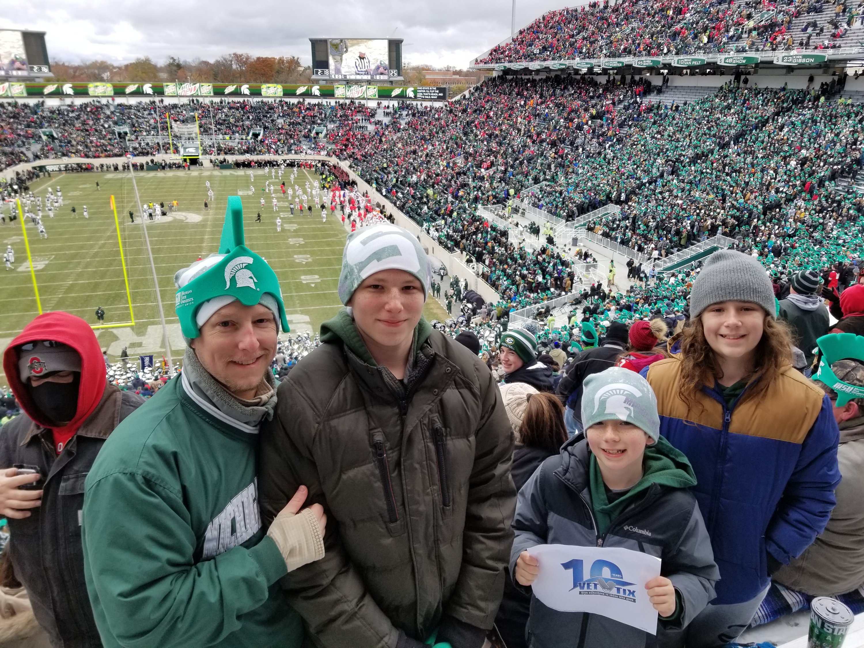 VetTix, It is hard to express how much my sons and I appreciated the opportunity to attend this football game. It is very hard to get tickets for OSU home games and we had never been to an away game so when these tickets became available, it truly was a small blessing. My sons attend the same high school as some of the MSU football players (St. Edward - Lakewood, OH) so it was a treat for them to see those guys playing in person at the Division I level. The best part for me (besides the victory) was how friendly all of the MSU fans were. Almost everyone we came in contact with welcomed us to East Lansing and asked us where we were from and how our trip went. I only hope that our (OSU) fans treat visitors to Columbus the same way. Thank you again for an amazing experience. Best wishes to you and your family this holiday season.