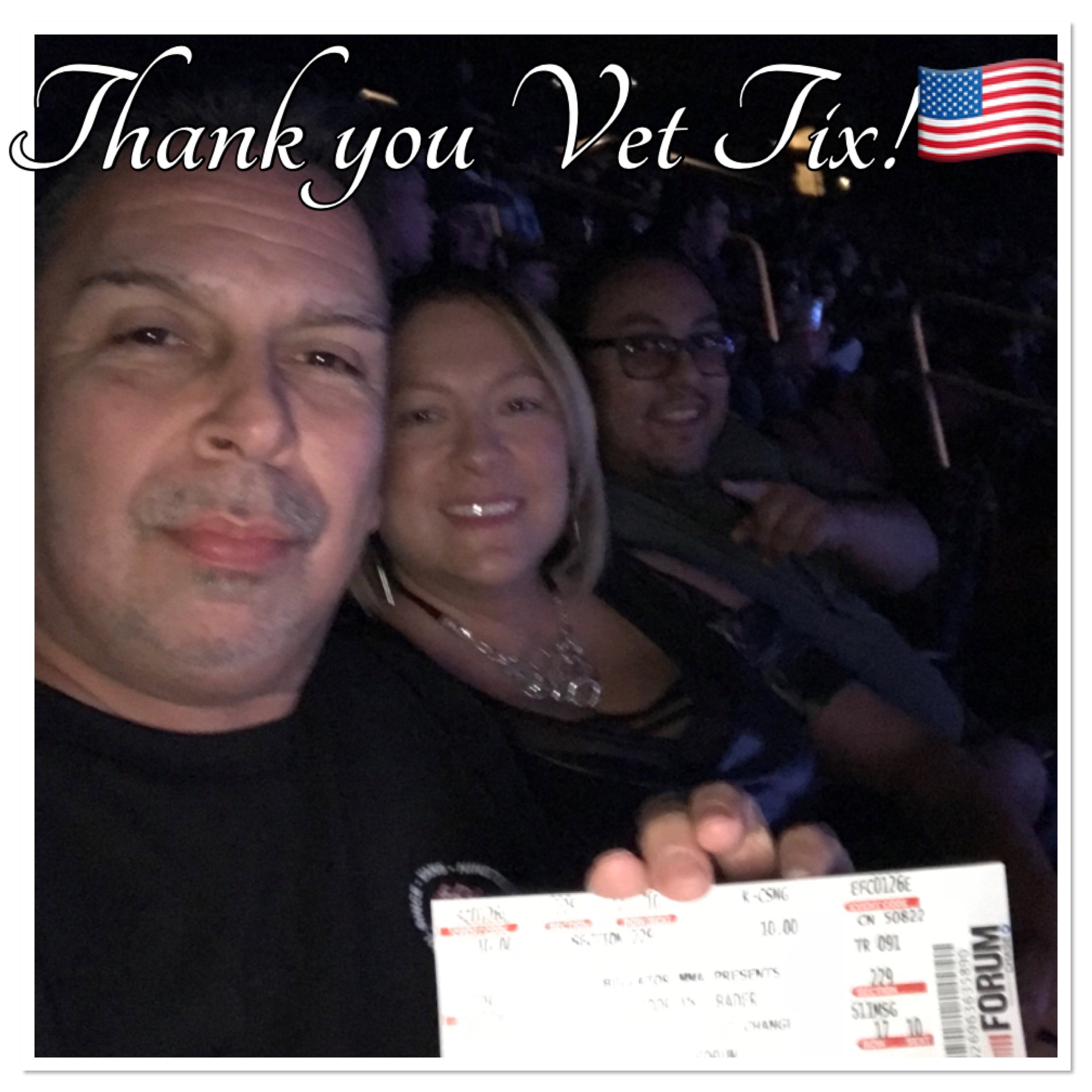 Thank you very much for the tickets for me and my family to attend this event. Being 100% disabled veteran I don't get out to often but having opportunities like this makes my day. Thank you for all you do for us Veterans. Thank you again, Richard Quinonez Disabled Veteran USAF
