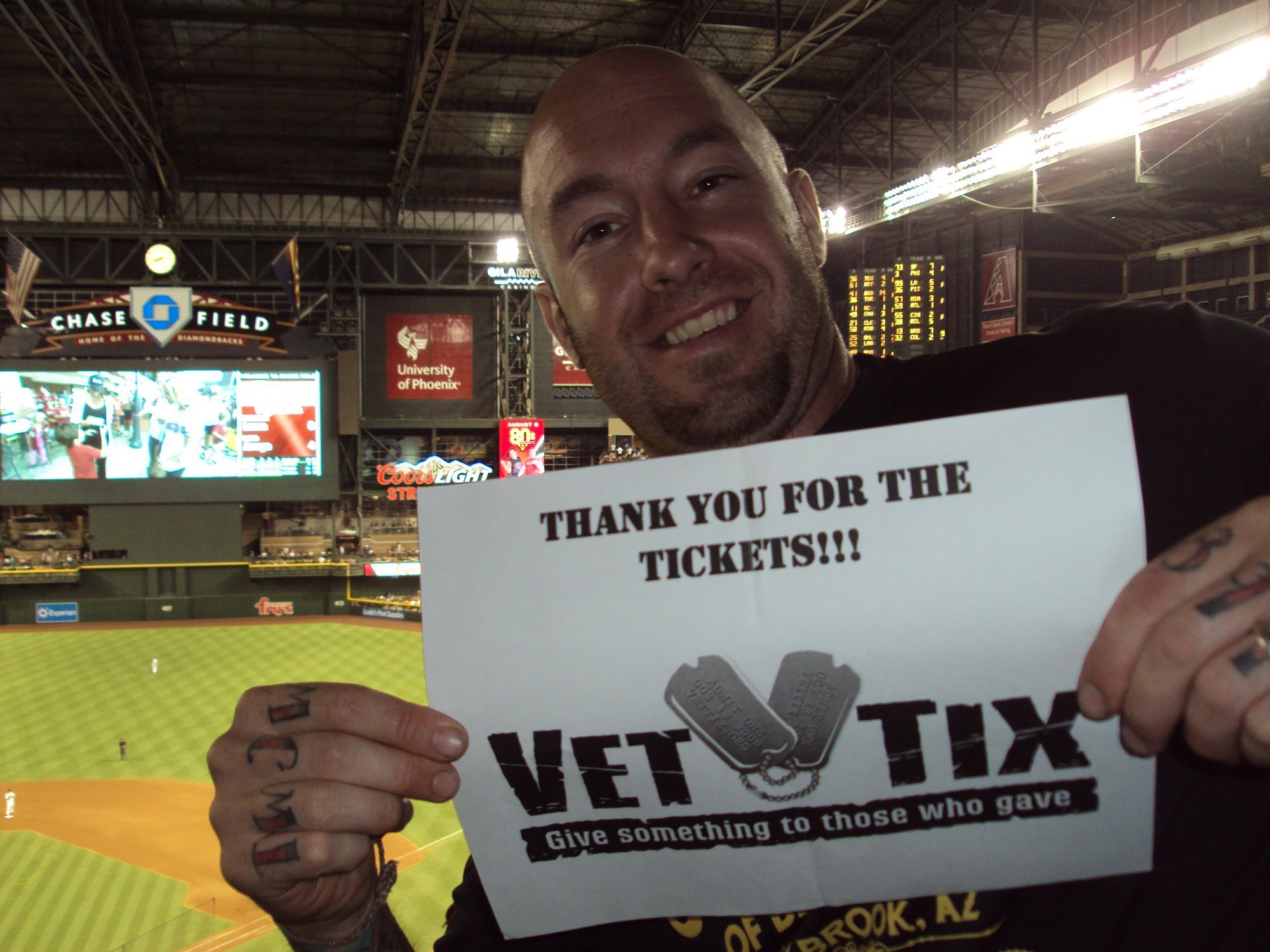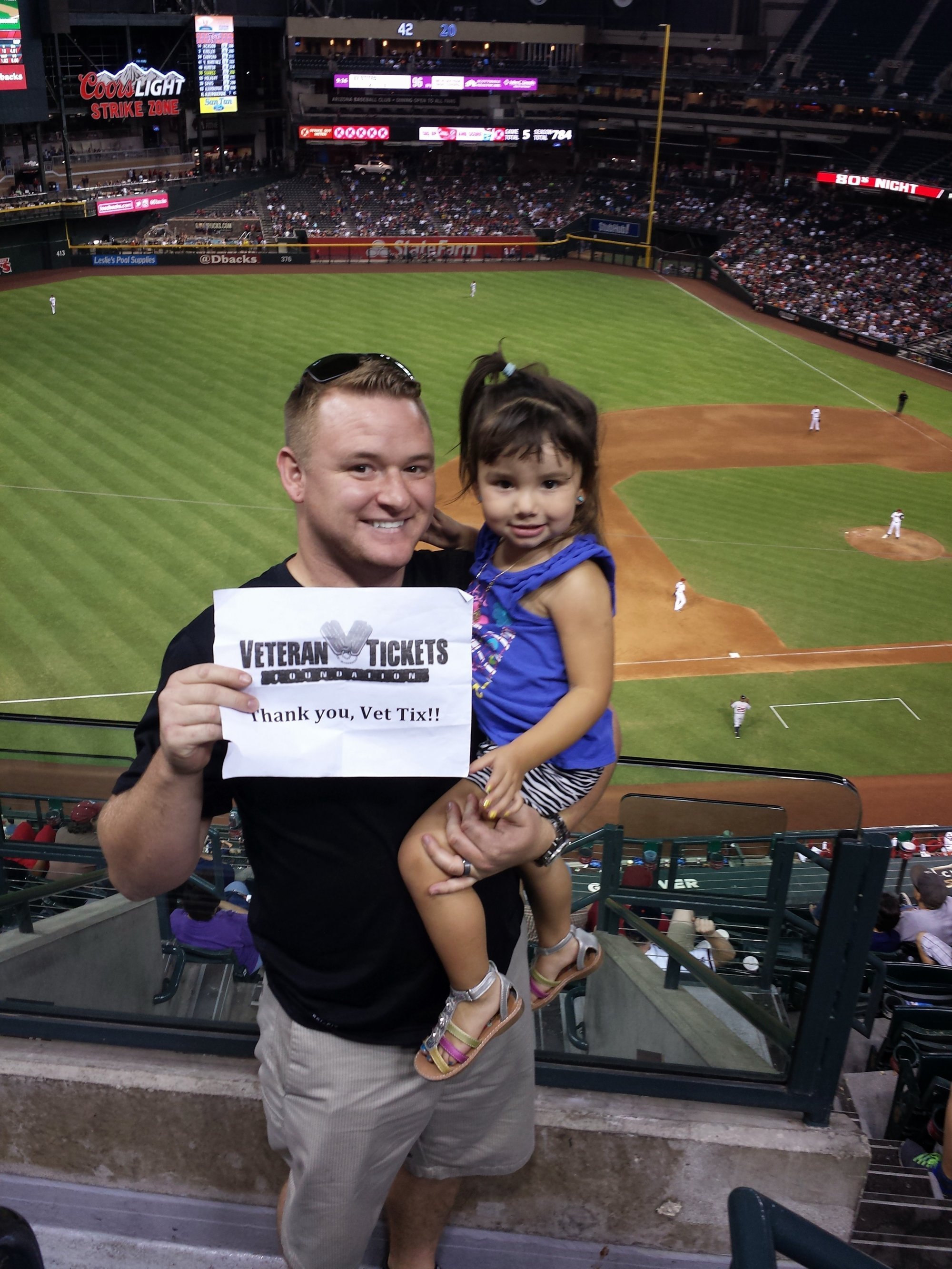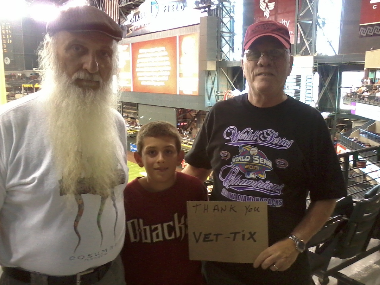 Thank you so much for the tickets. My buddy from work hasn't seen a Tigers game in years and is from Detroit. So is my Dad. Good thing the Diamondbacks provided so many tickets to Vets who were actual D Backs fans because it helped drown out the loud Tigers fans. We spent lots of $$ on food and drinks so you can always count on us to support your team in any way possible! Hooah! SGT Berry OIF 03-04, 09-10 Border Mission 2011, Operation Katrina 2005