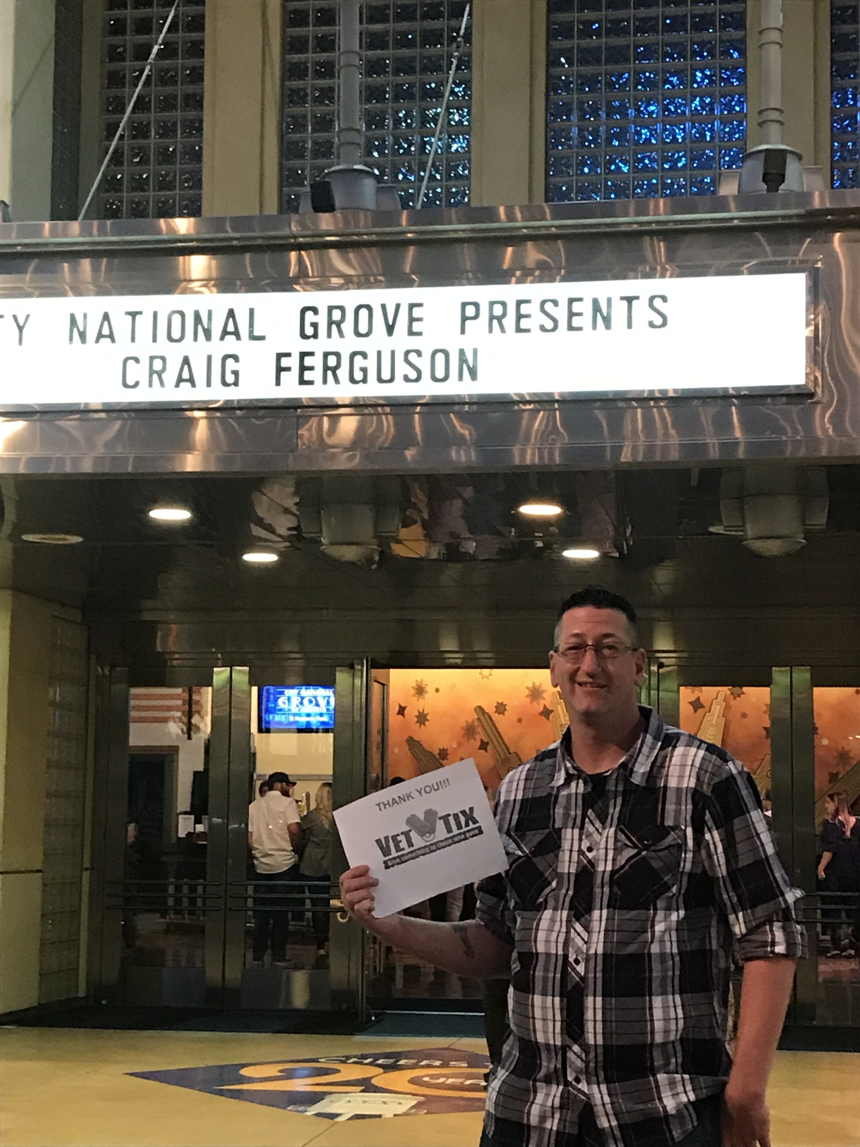 Thank you Vettix and the private Donors for the Craig Furguson, Hobo Fabulous tickets at the Anahiem Grove. We appreciated the opportunity to see our favorite late night host again Thank you, to the donors, for supporting those who serve/served and their families.
