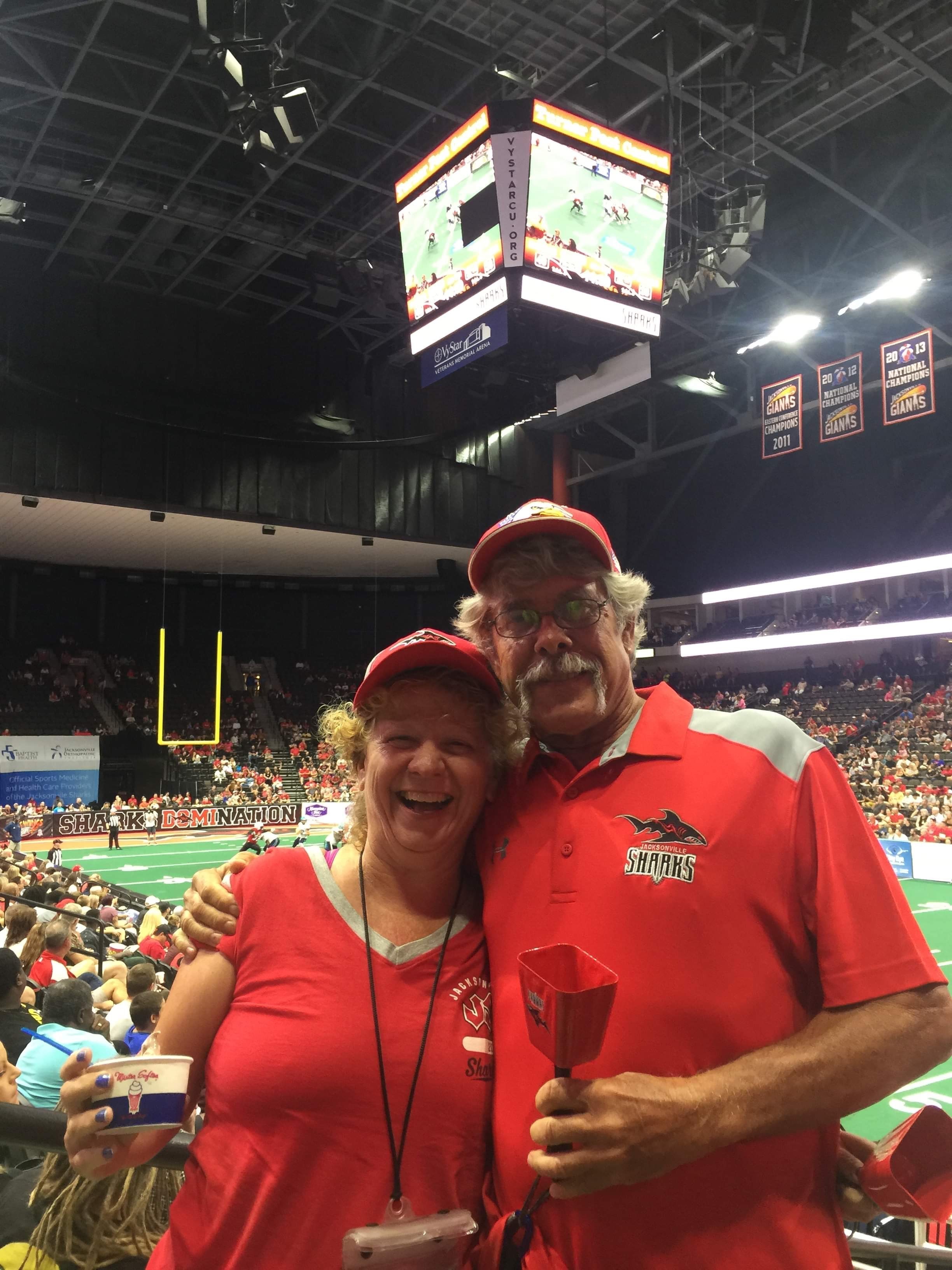Thank you so much to the Jacksonville Sharks for giving my family and I the opportunity to experience the Jacksonville Sharks game against the Pirates. My daughters always thought football was boring but this experience changed their minds. It also allowed my wife and I to enjoy a great experience with our children. We can't wait to return. Sorry we didn't have any sharks gear. Jaguar fans trying to show support for our Arena Football team. Go Sharks!