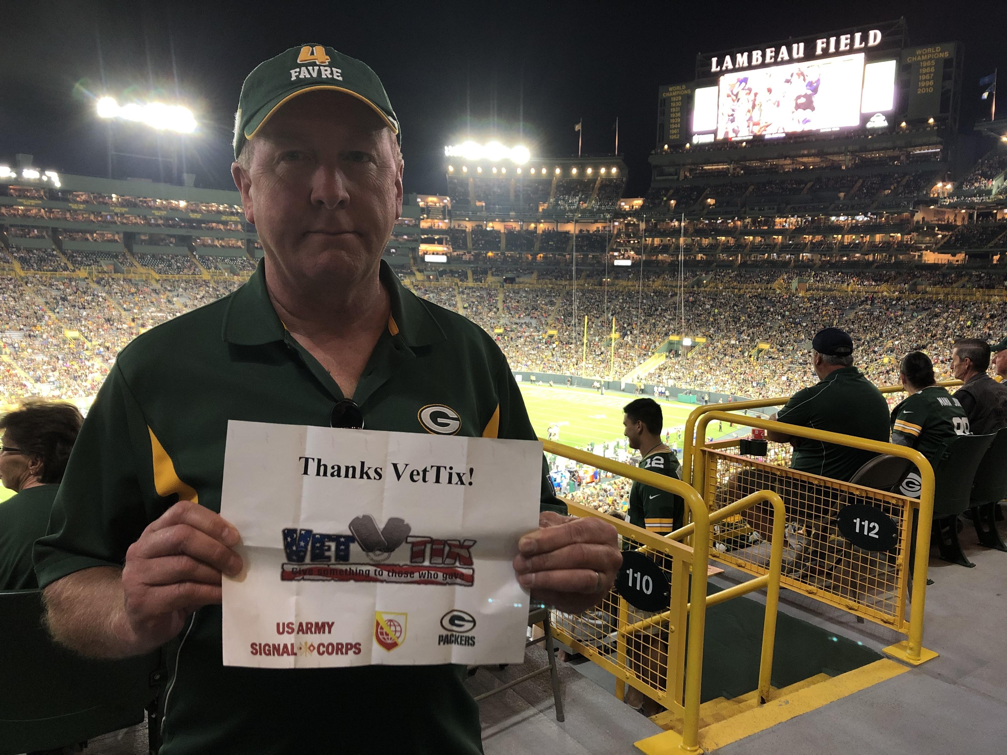 Thank you vettix.org and ALBERTS PLASTERING INC. I had a great time at the game. Go Packers.