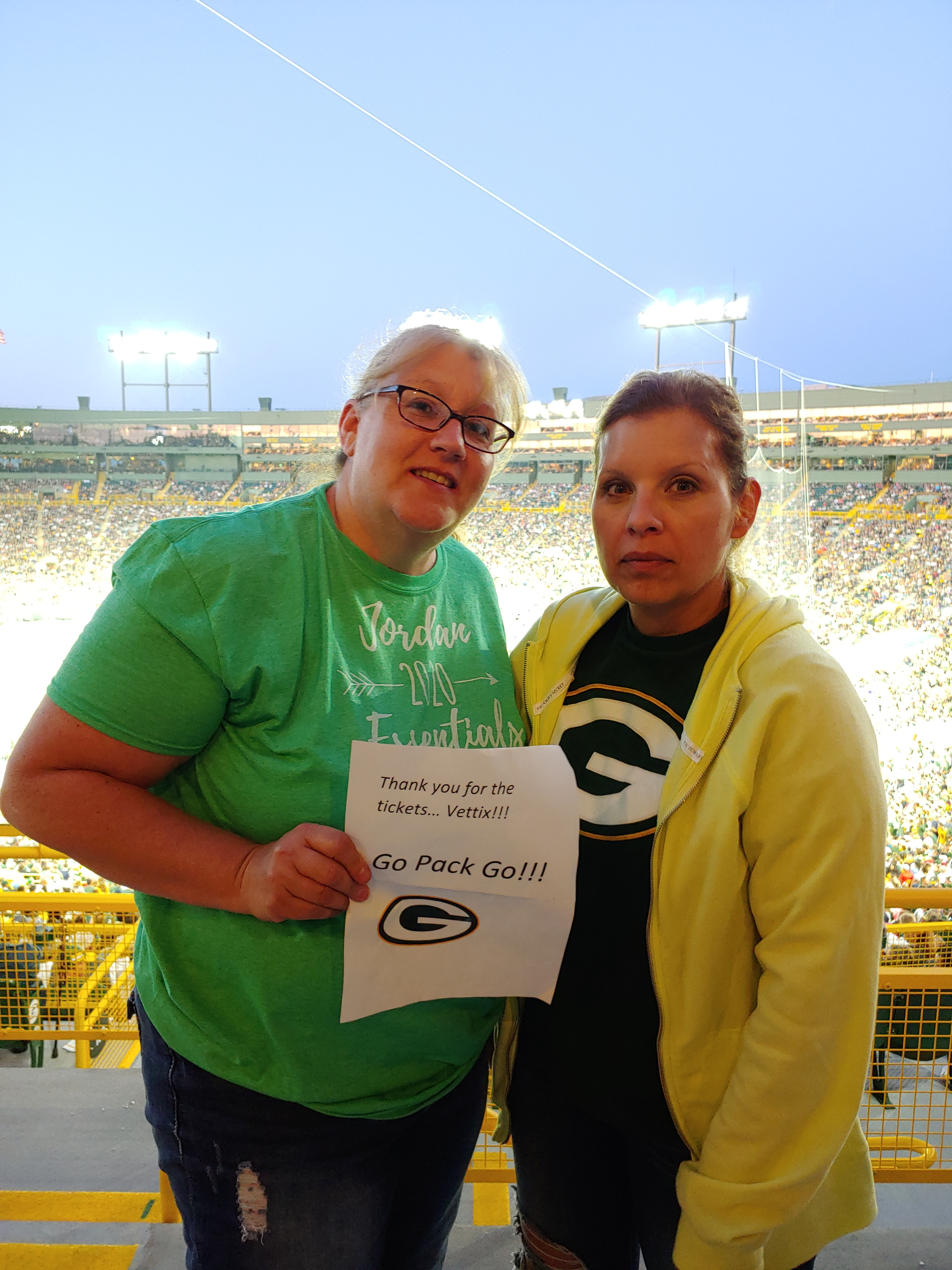 I want to thank Vettiz and the amazing people who donate their tickets. I had an amazing night with my friends. Even made new ones. I love going to Packer Games and you made it possible, so thank you.