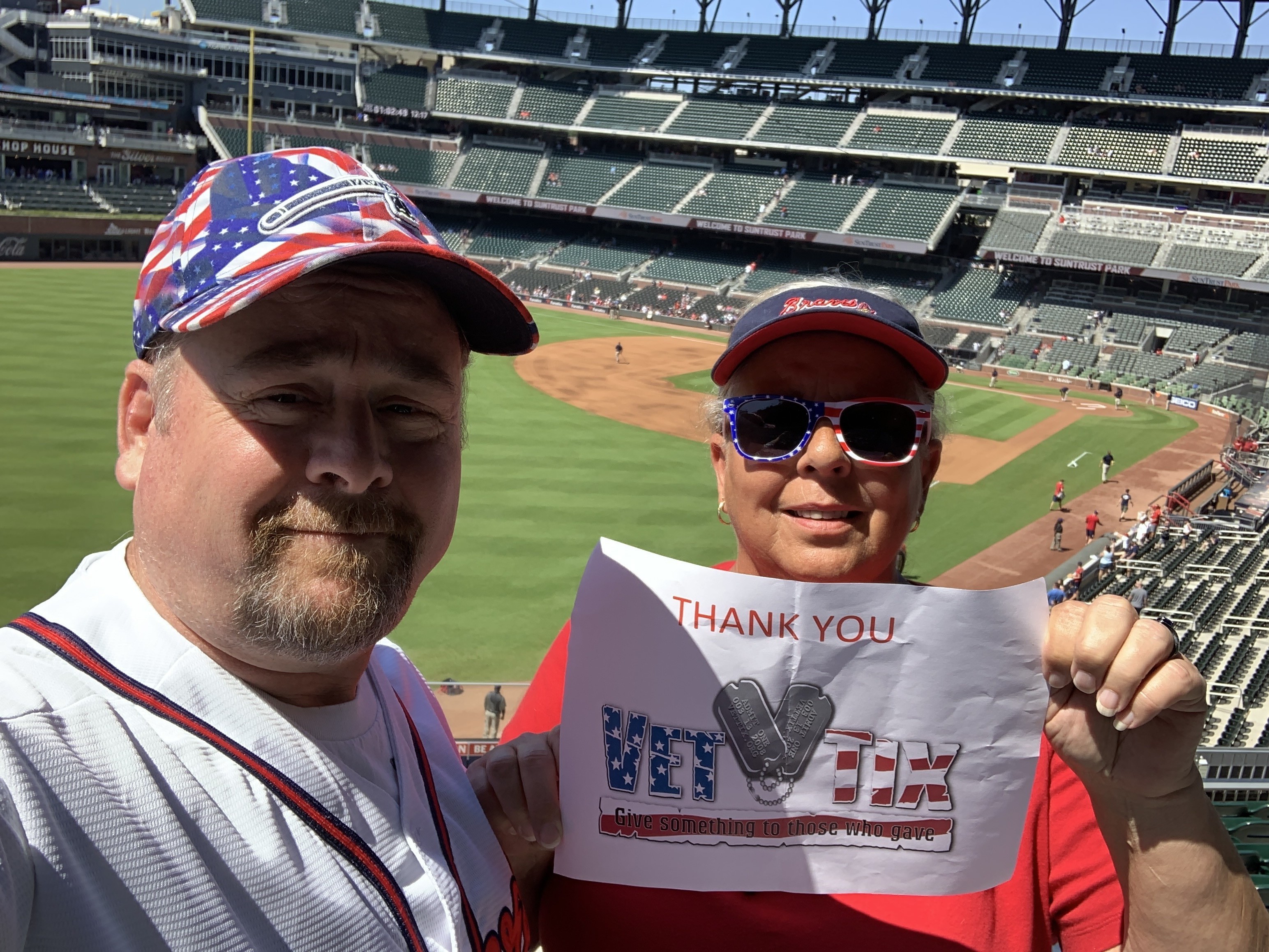 Thank you to the Atlanta Braves and loyal fans for donating tickets to the game. My husband and I had an AWESOME first experience in the new Stadium! We sat beside other Vettix recipients and the camaraderie was incredible.