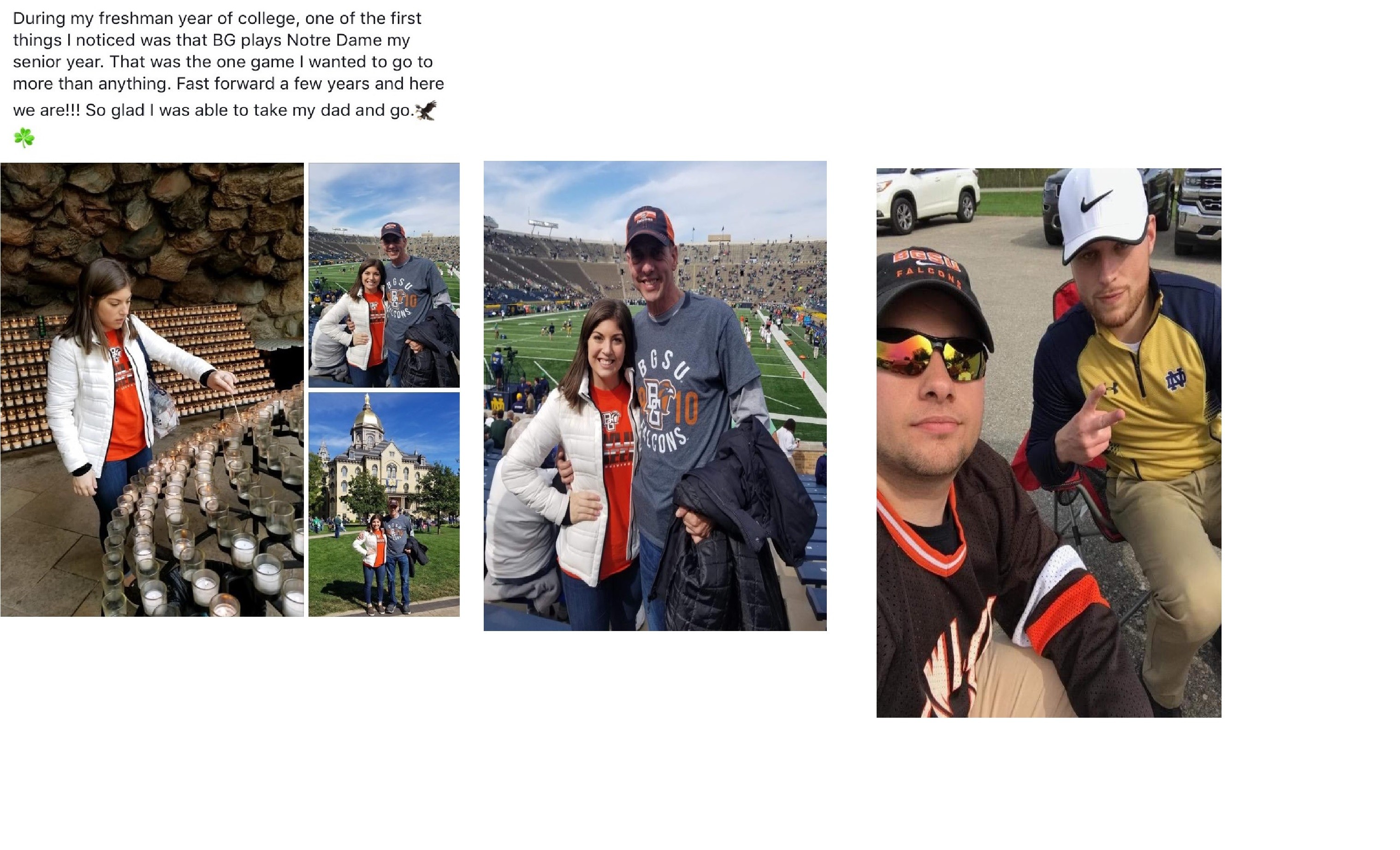 My brother and his daughter and friends attended the game. Daughter: "During my freshman year of college, one of the first things I noticed was that BG plays NotreDAme my senior year. That was the game I wanted to go to more than anything. Fast forward a few years and here we are!! So glad I was able to tale my dad and go."