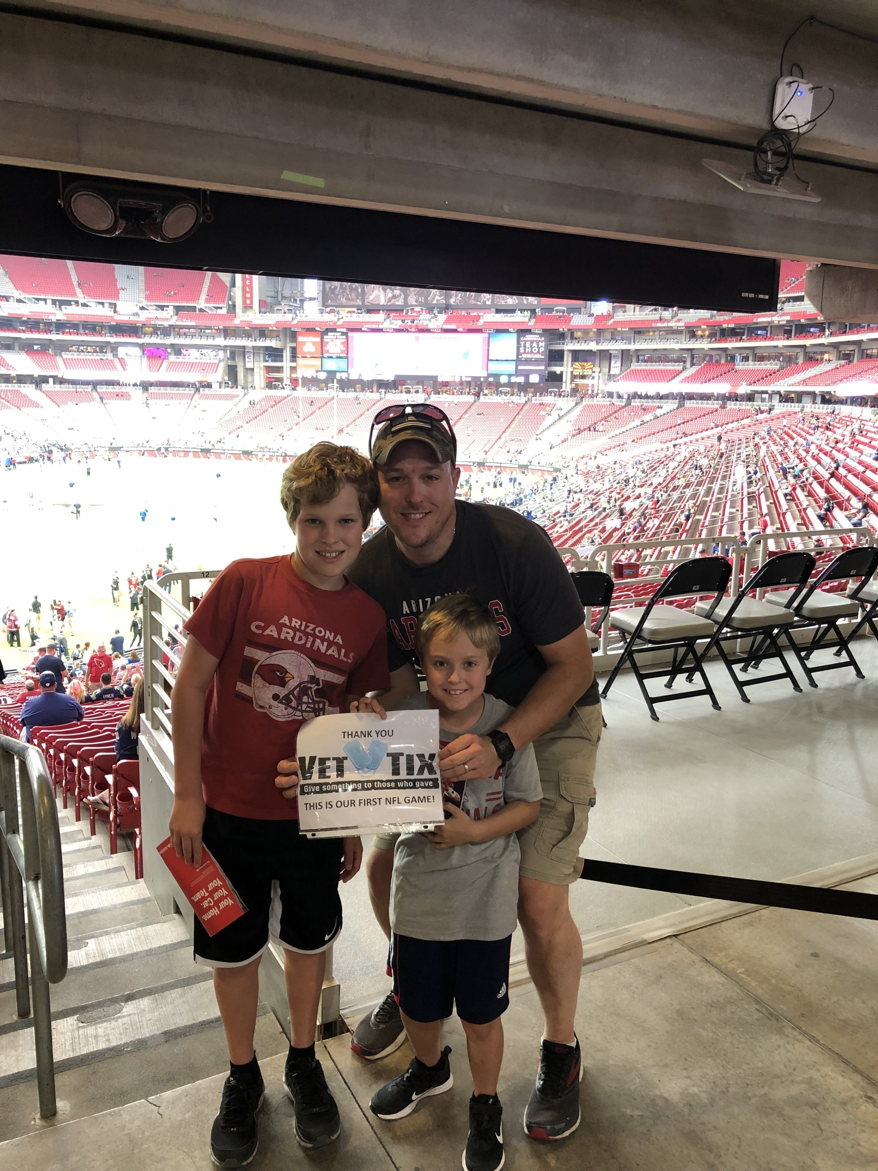 This was my two boys first NFL game and they had a blast. They have not stopped talking about the entire experience. They got to meet the mascot when we were walking into the stadium. You will never know how much this means to my boys and especially me for being able to take them to the game, so I thank everyone (VetTix, AZ Cardinals and anonymous donors) from the bottom of my heart that made this experience possible.
