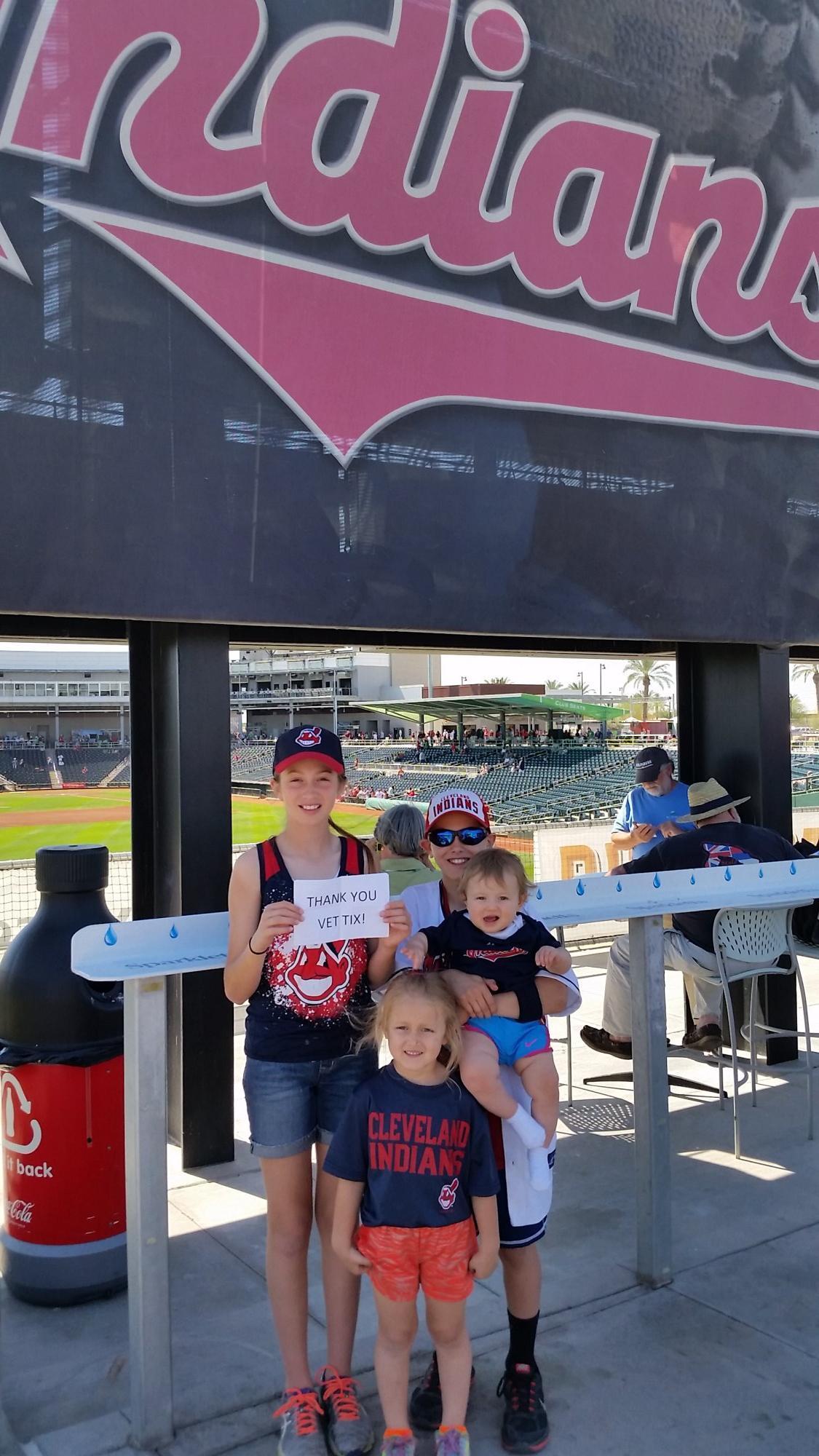 Thank You Vet Tix and Goodyear Ballpark for donating the tickets for my wife and me for the Indians/Reds game. We had great seats beyond first base and came close to catching a foul ball! The weather was fantastic and we thoroughly enjoyed ourselves. Thanks again. Gale Pence