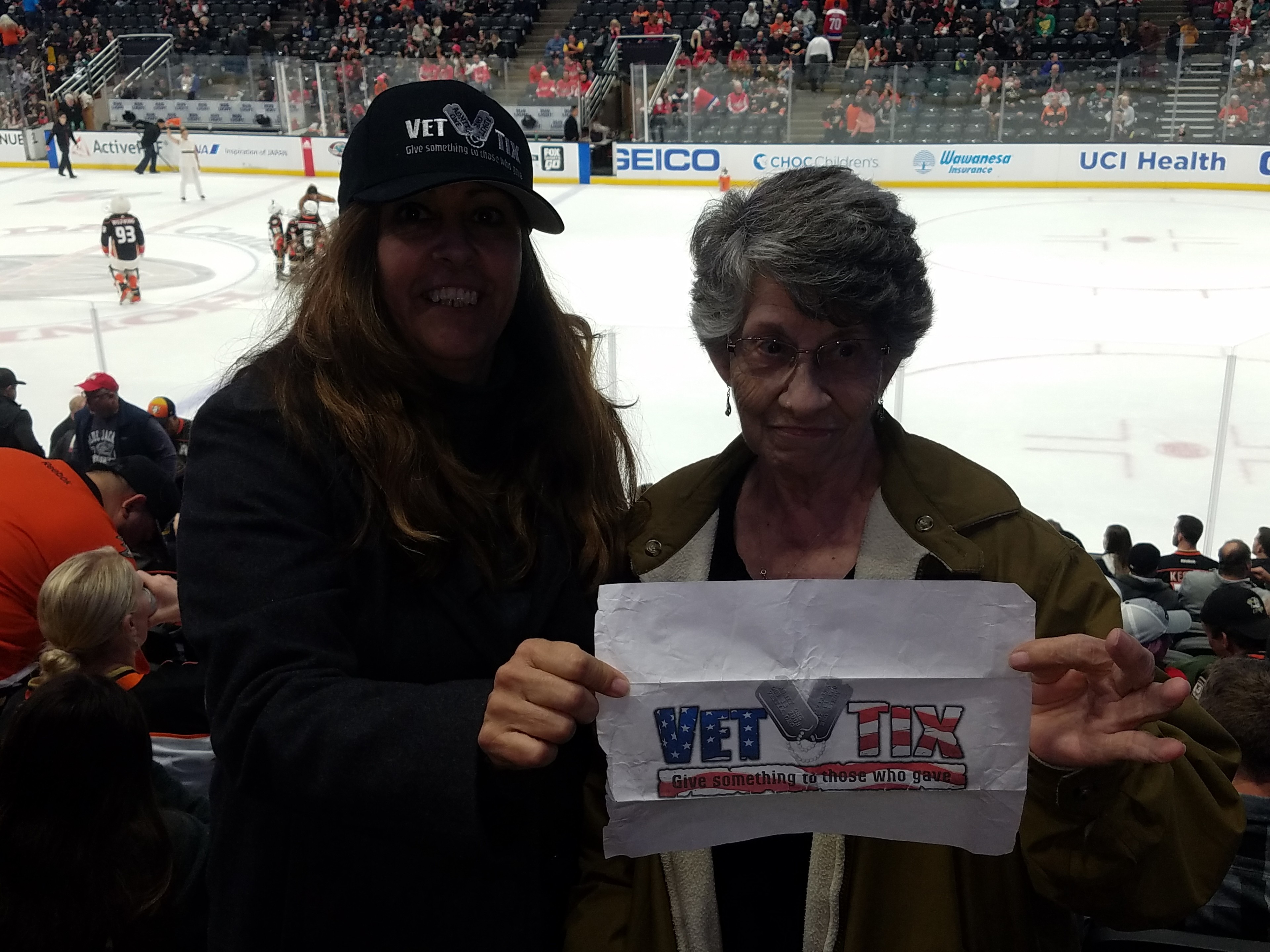 Thank you Anaheim Ducks NHL, Honda Center, and VetTix for the best seats I've ever sat at during a Hockey game to enjoy with another vet!