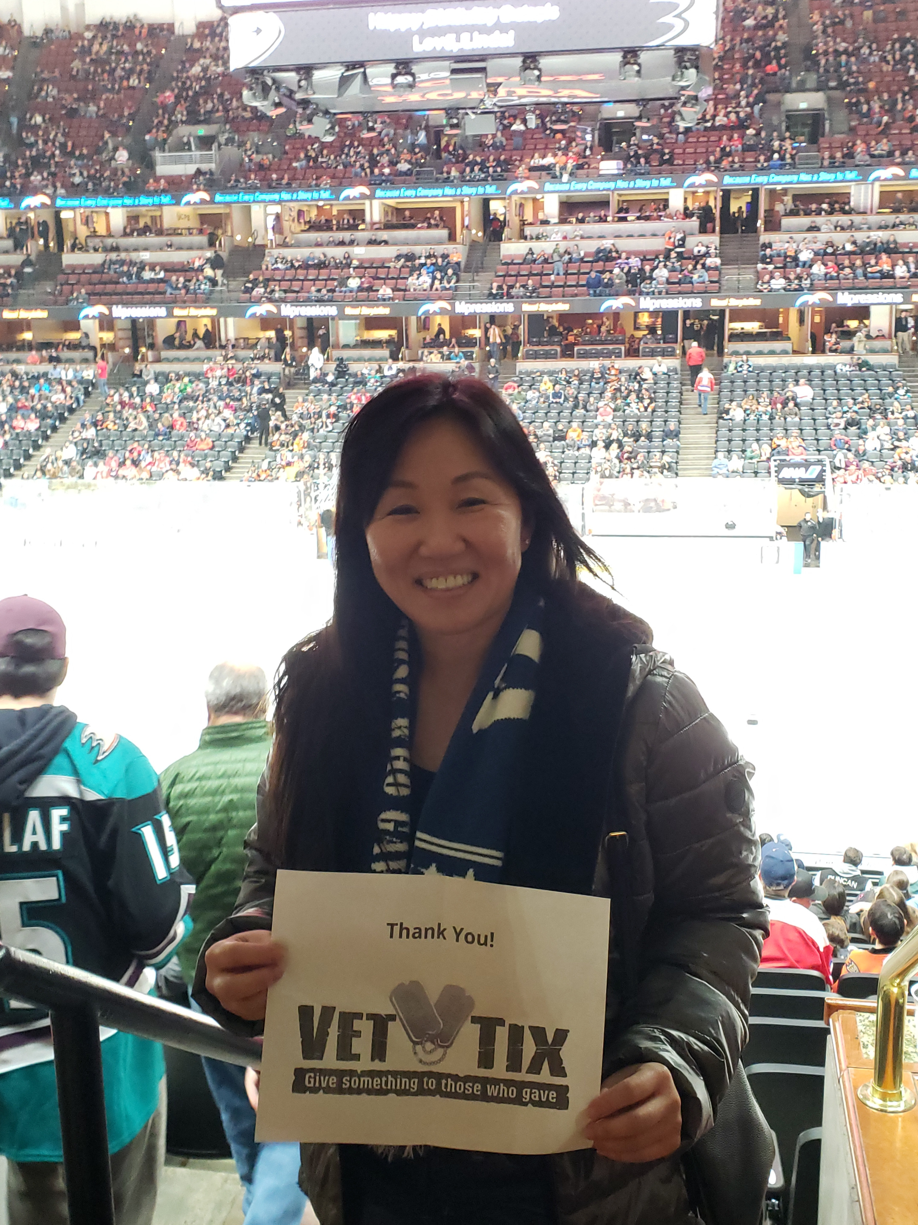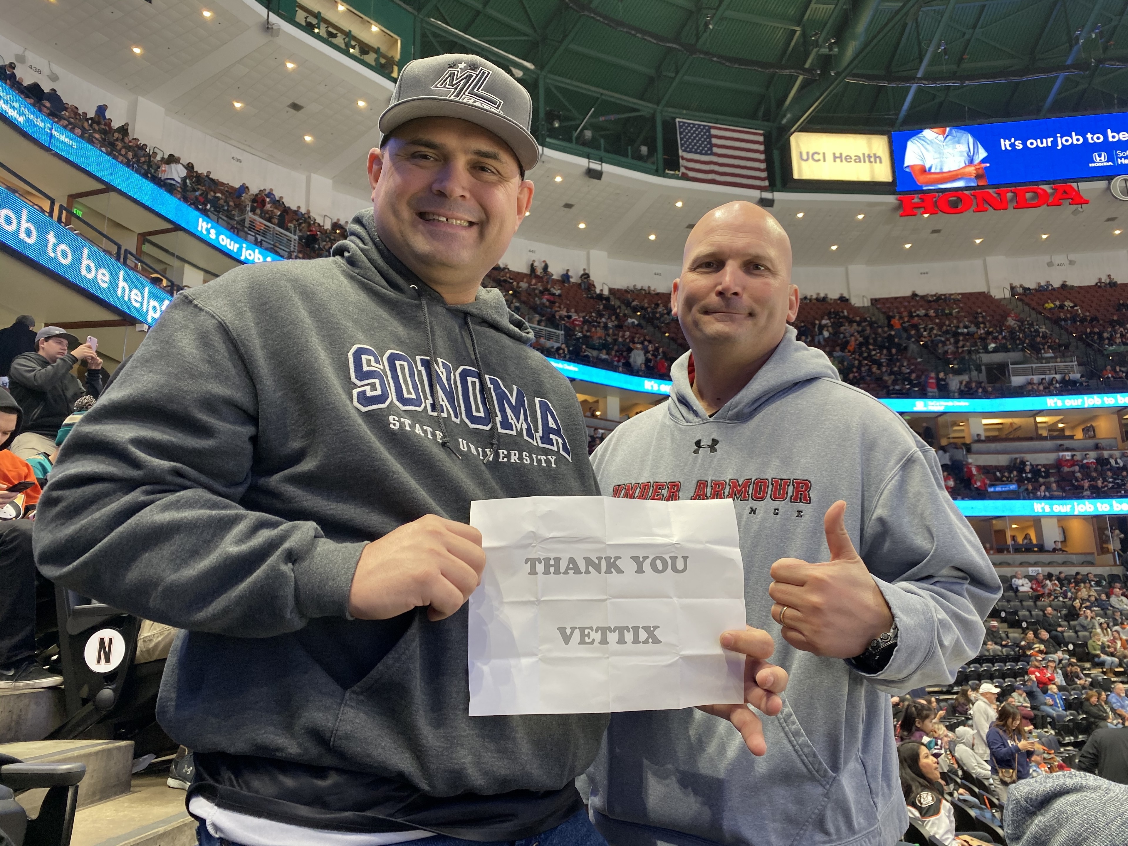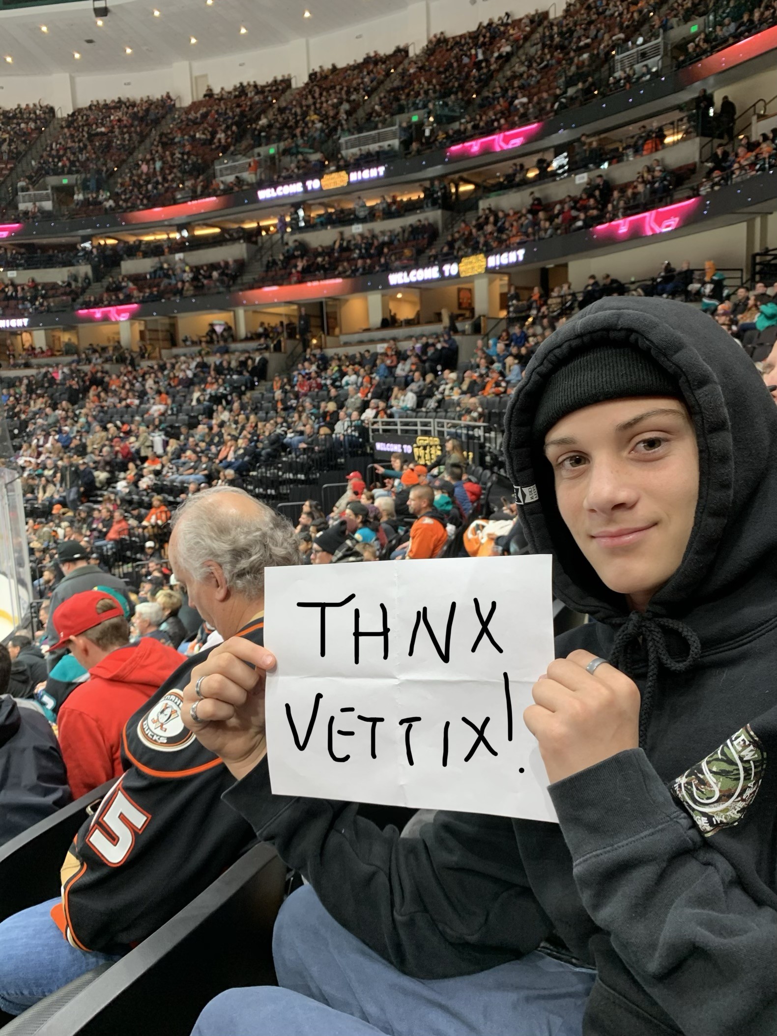 Thank you Vettix and Anaheim Ducks for enabling my son and I to attend the game. Awesome game despite the Ducks lost. Thank you!