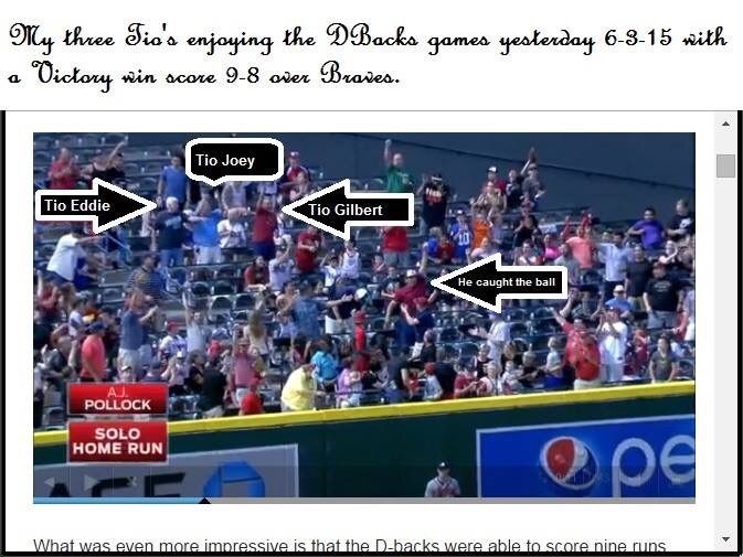 Great comeback Win for the Arizona Diamondbacks 9-8 over the Atlanta Braves to win the series. My brother US Air Force retired Eddie Gomez and my two other brothers Joe and Gilbert were near the game tying home run in the left field bleachers @ Chase Field! Thank you Vettix!