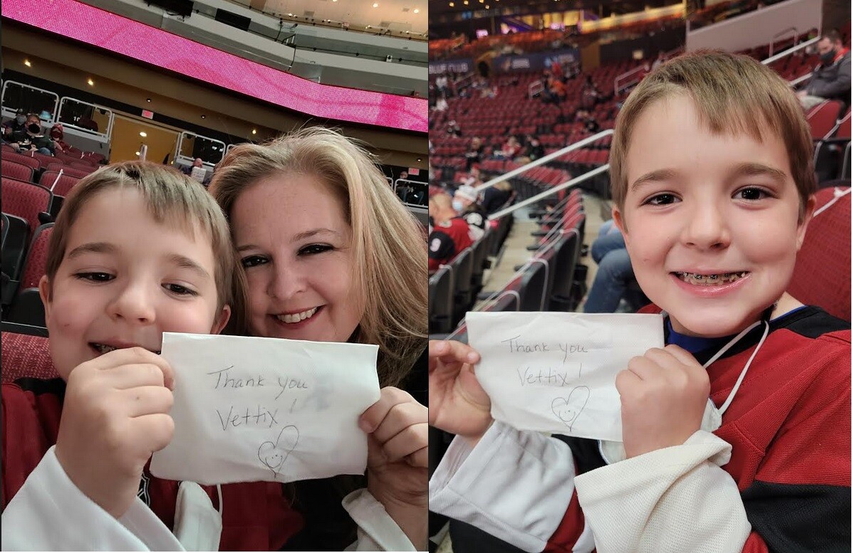 Thank you Vettix and Coyotes! My son and his mother had a blast (and they dropped their sign in the parking lot, but still talked to fellow Vets and created a new sign). What a great experience they had!!!