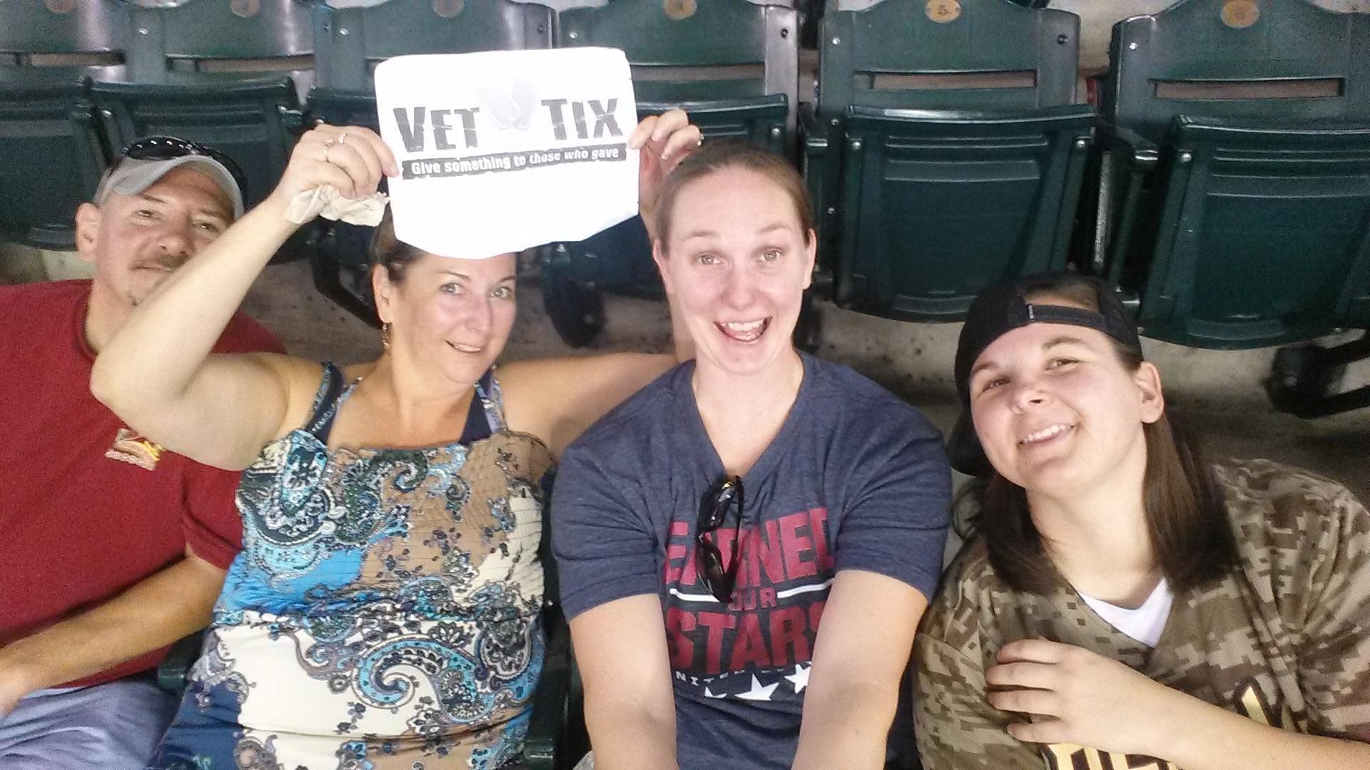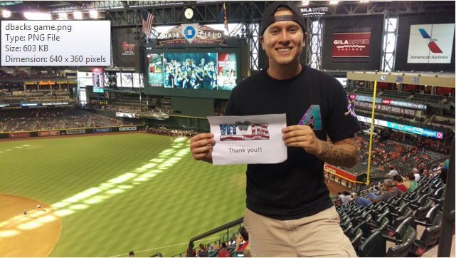 Thank you to the donor of these tickets, spending time with family after so many years of missing great events with the family is a blessing. My father in laws favorite team was the Oakland A's and he passed away 2 years ago and he never got to see them with me. My wife said that the A's had angels in the outfield that was why they won. Rest in Peace Tom "Q" (Vietnam vet US Army). Thank you once again for the tickets it was an awesome experience!!! P.S. I had my VET TIX t-shirt under the Diamondbacks that I won at the game! Respectfully, Ross USMC MSGT