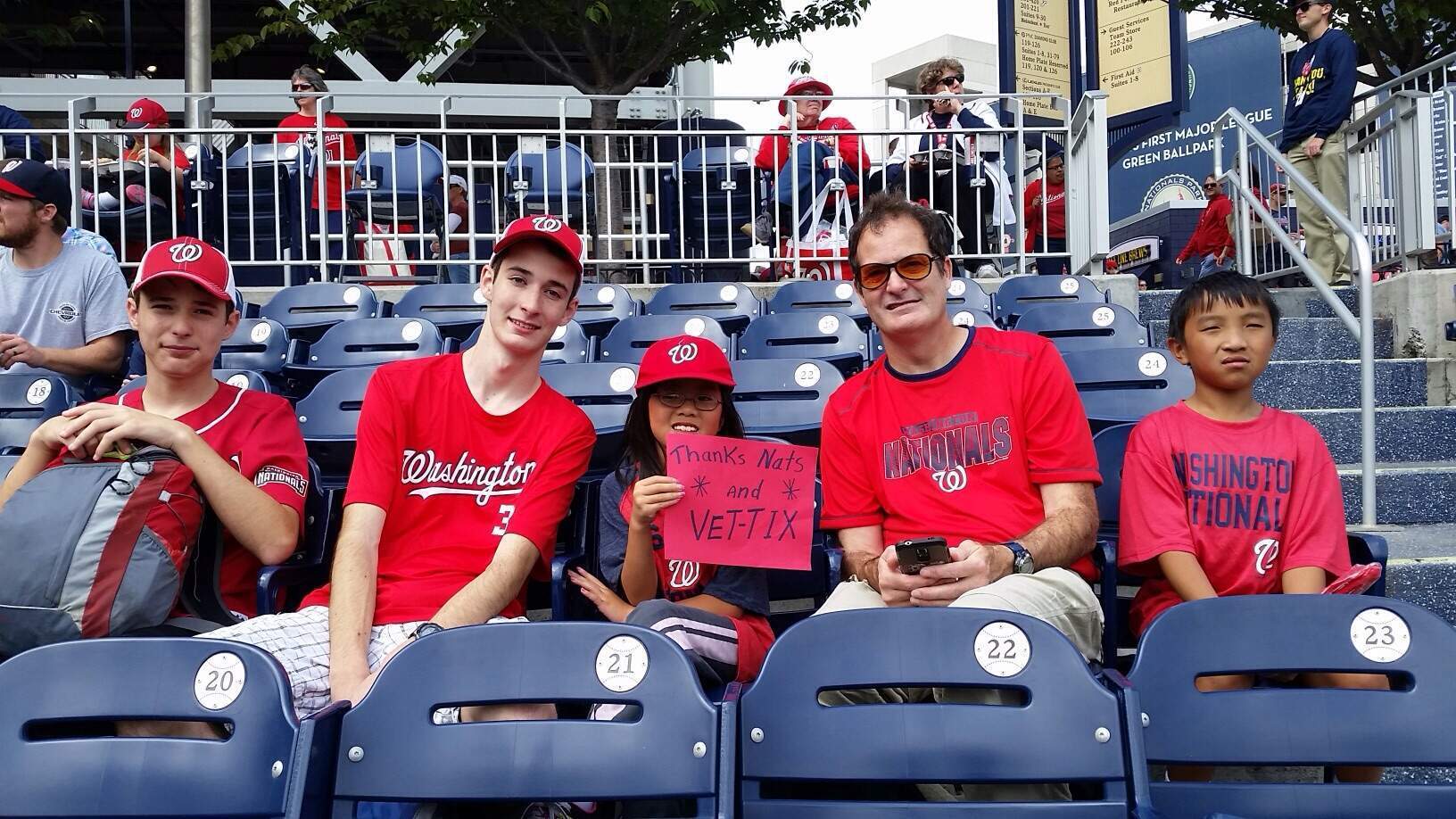 Thank you to the Washington Nationals for the tickets to the game. Even though we didn't get the win it was a great game and the 4 of us had a great time. We vets appreciate your kindness. Thank you so much. Jonathan