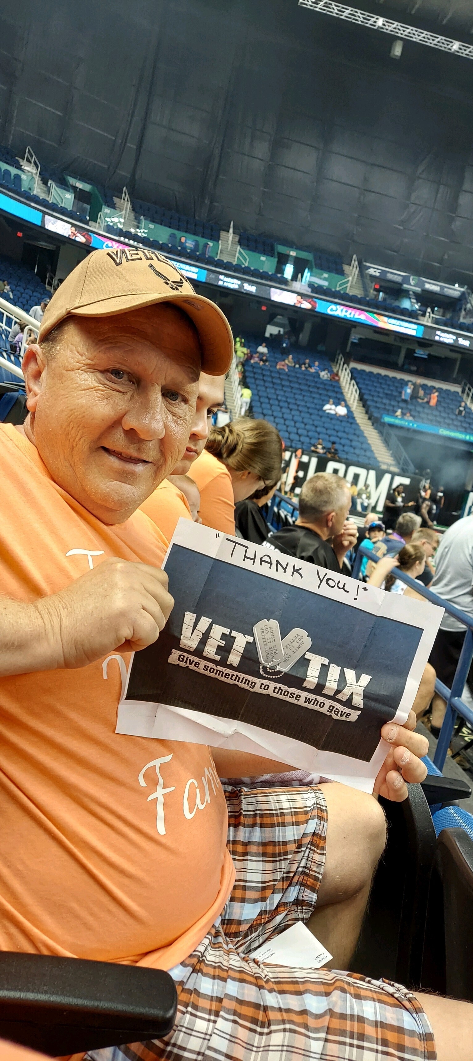 First things first, my wife bless her heart she made an awesome laminated vet-tix sign that I have posted before and she was away this weekend visiting and wasn't able to attend and she keeps up with our sign. I took the picture with it but I didn't do it inside as you can see. I tell you vet-tix constantly impresses me this time my son one of his friends and my cousin went, and WOW such great experience and I think that this was the best event all thanks to vet-tix that I have attended so far, very intense hard hitting excellent seats as always. Thanks again VET-TIX, sorry for not taking the picture inside the venue.