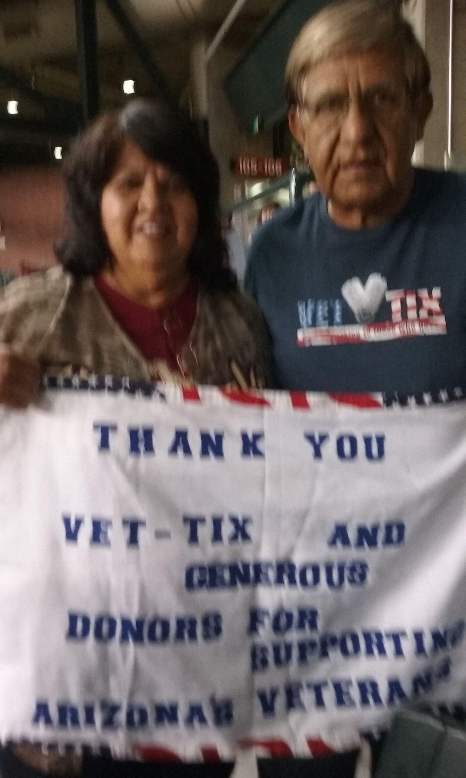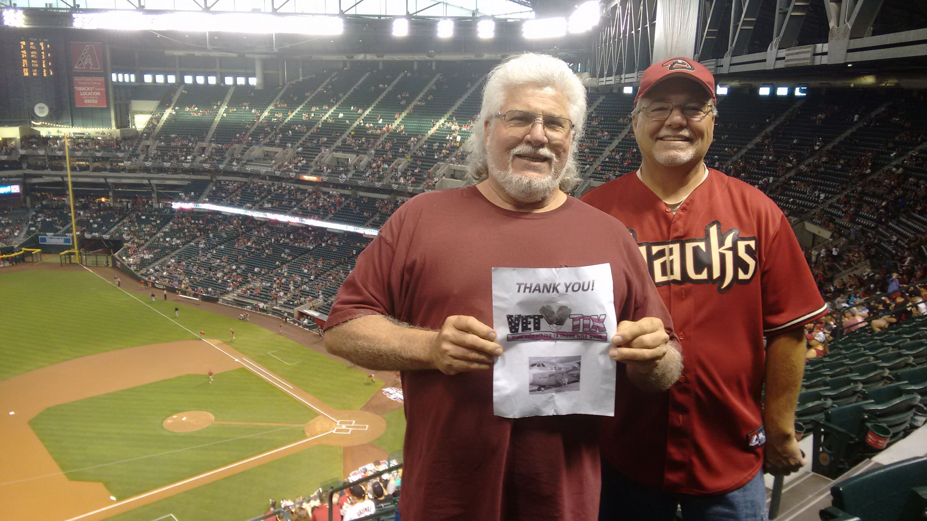 My wife and I had a wonderful time. Thank you Vet Tix and the Arizona Diamondbacks (MLB) for giving us the opportunity to attend opening day. The seats, the view and the game were fantastic. I send a picture with us holding up a sign but my cheap phone doesn't let it go to my email. I am really sorry about that!! Again, thanks for the wonderful time!