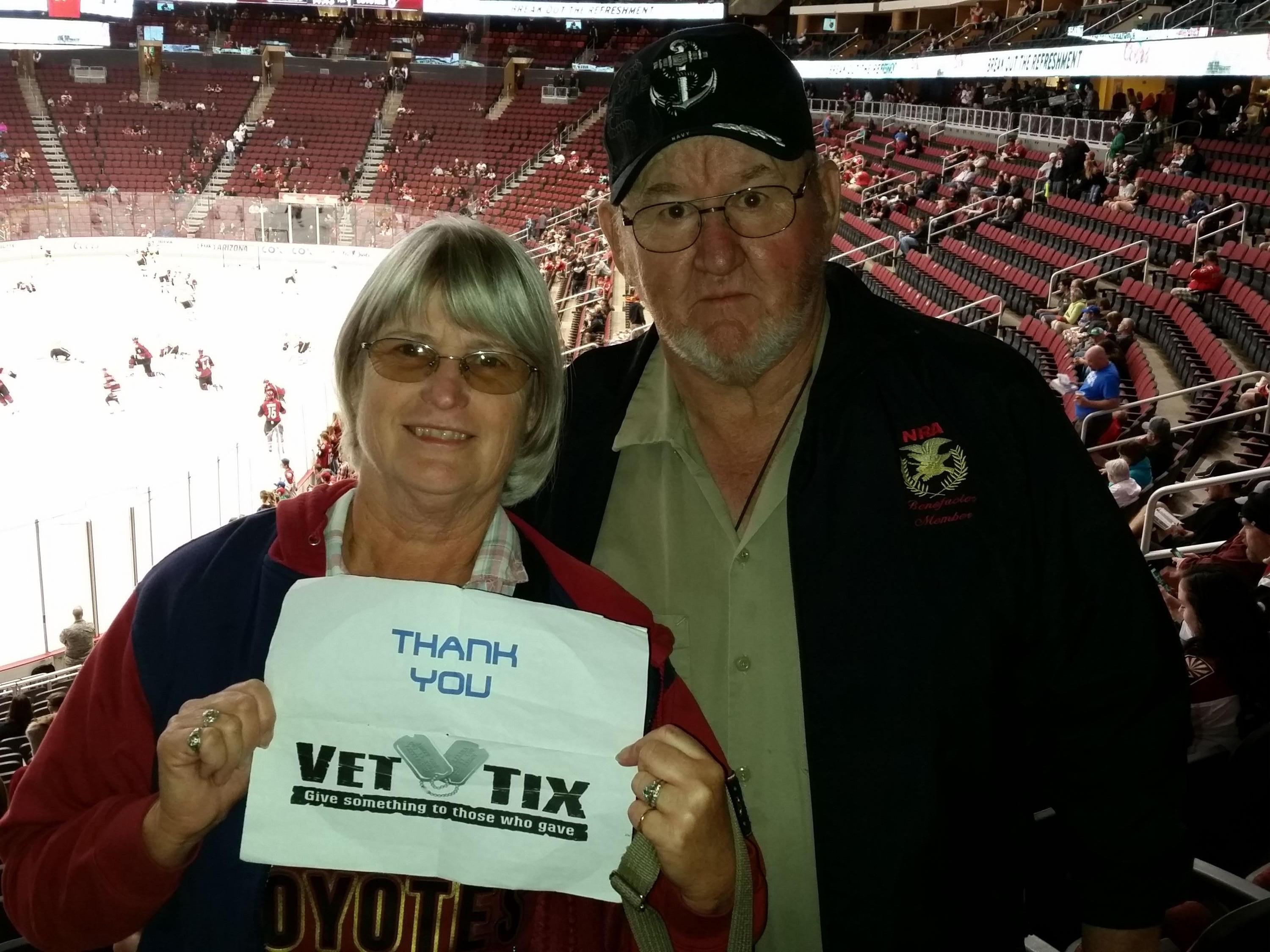 Thank you Coyotes, thoughtful donor and Vet Tix. It was an action filled game! We had a great time....didn't hear that horn and howl as much as we would have liked but was still a great game!! Thank you for giving us the chance to attend!!!