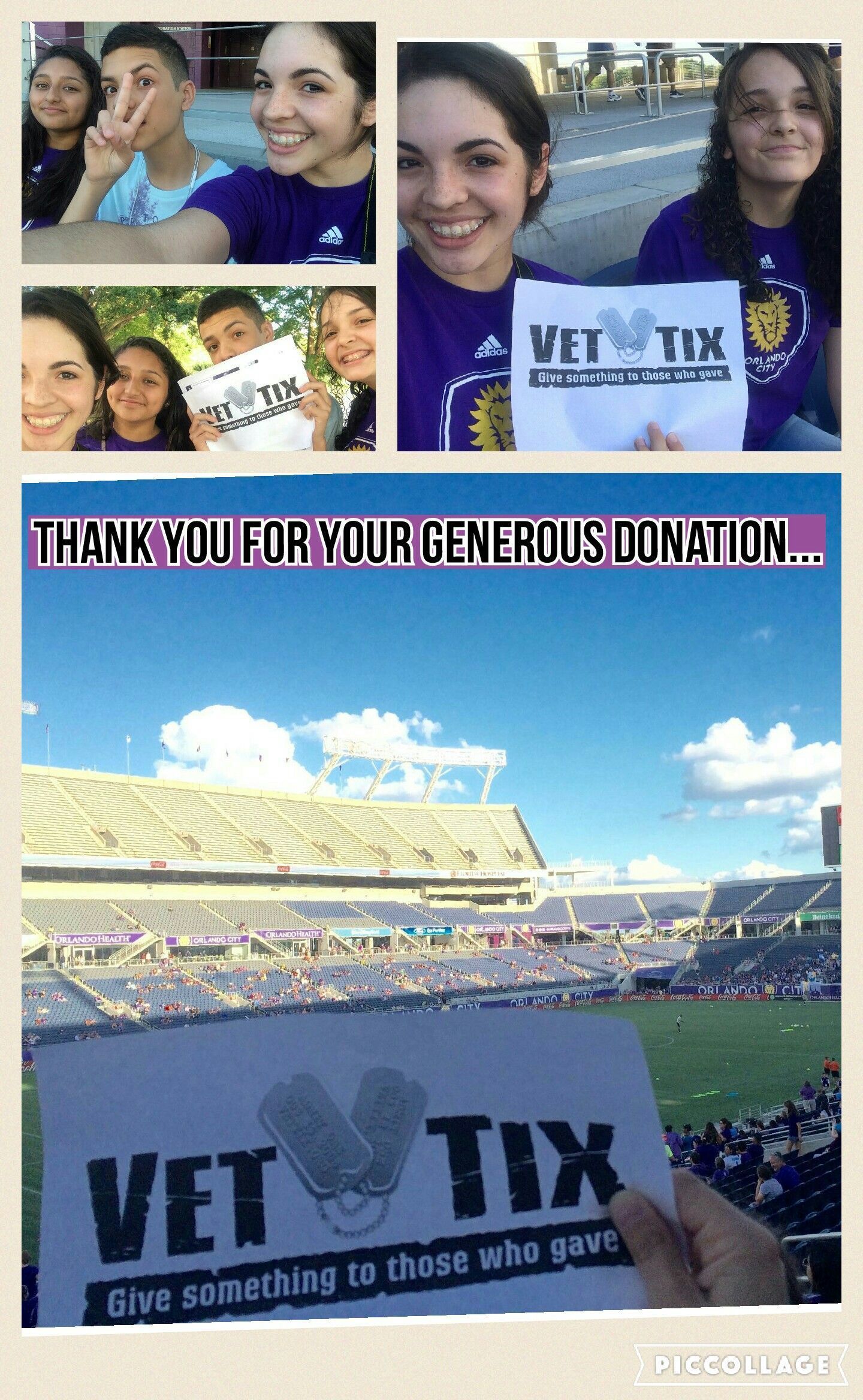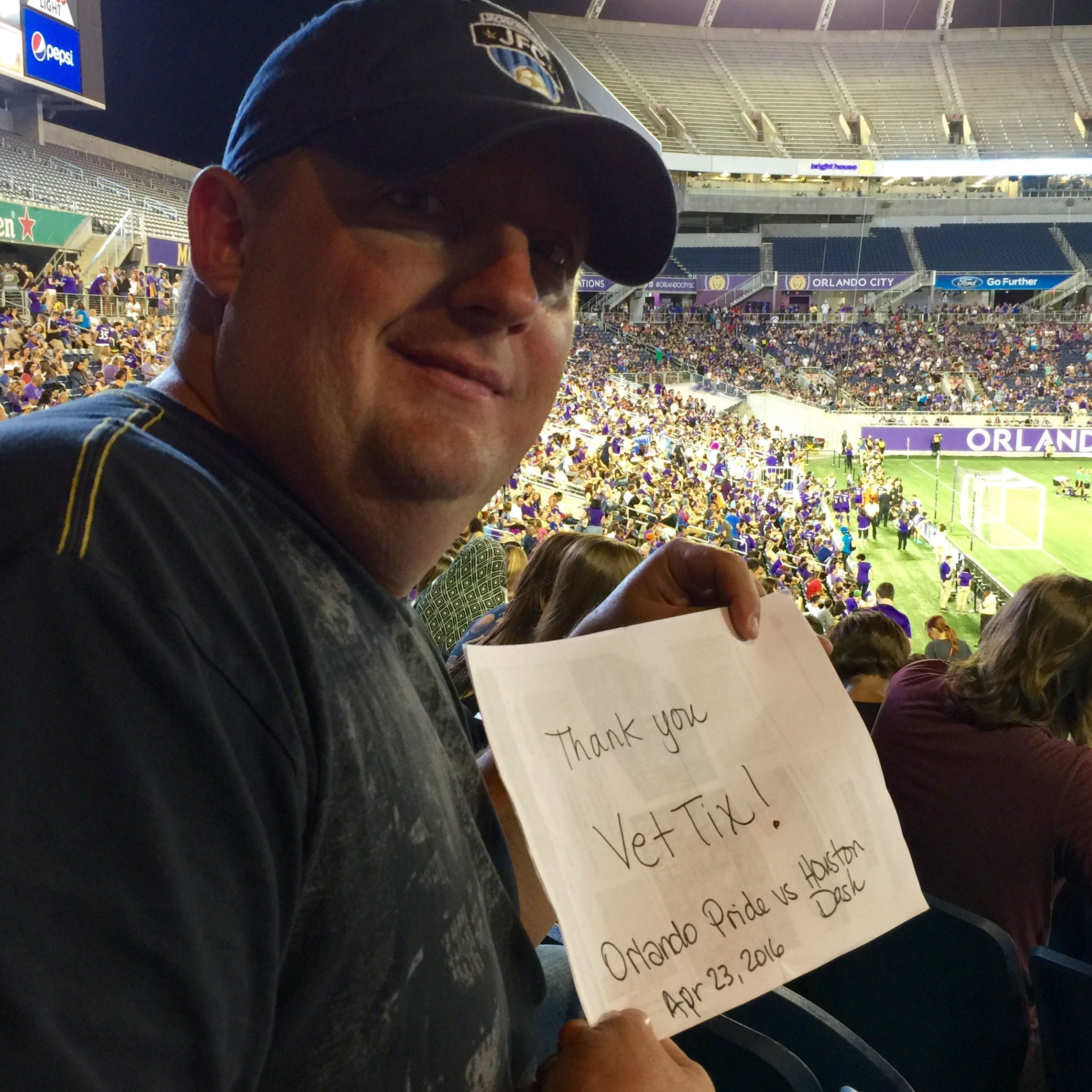 Thanks Orlando City FC! Took an Air Force buddy and his wife to the game and had a great time. Not only was it a gorgeous night but also a historic one for the Orlando Pride with a great home win and record crowd. We all feel that futbol is going to be the sport of choice for Orlando's fan base and the franchises are doing a great job of putting top notch teams on the field. Keep up the great, both the Orlando City FC and VetTix. Sorry I didn't take a photo at the game or wear my VetTix shirt.