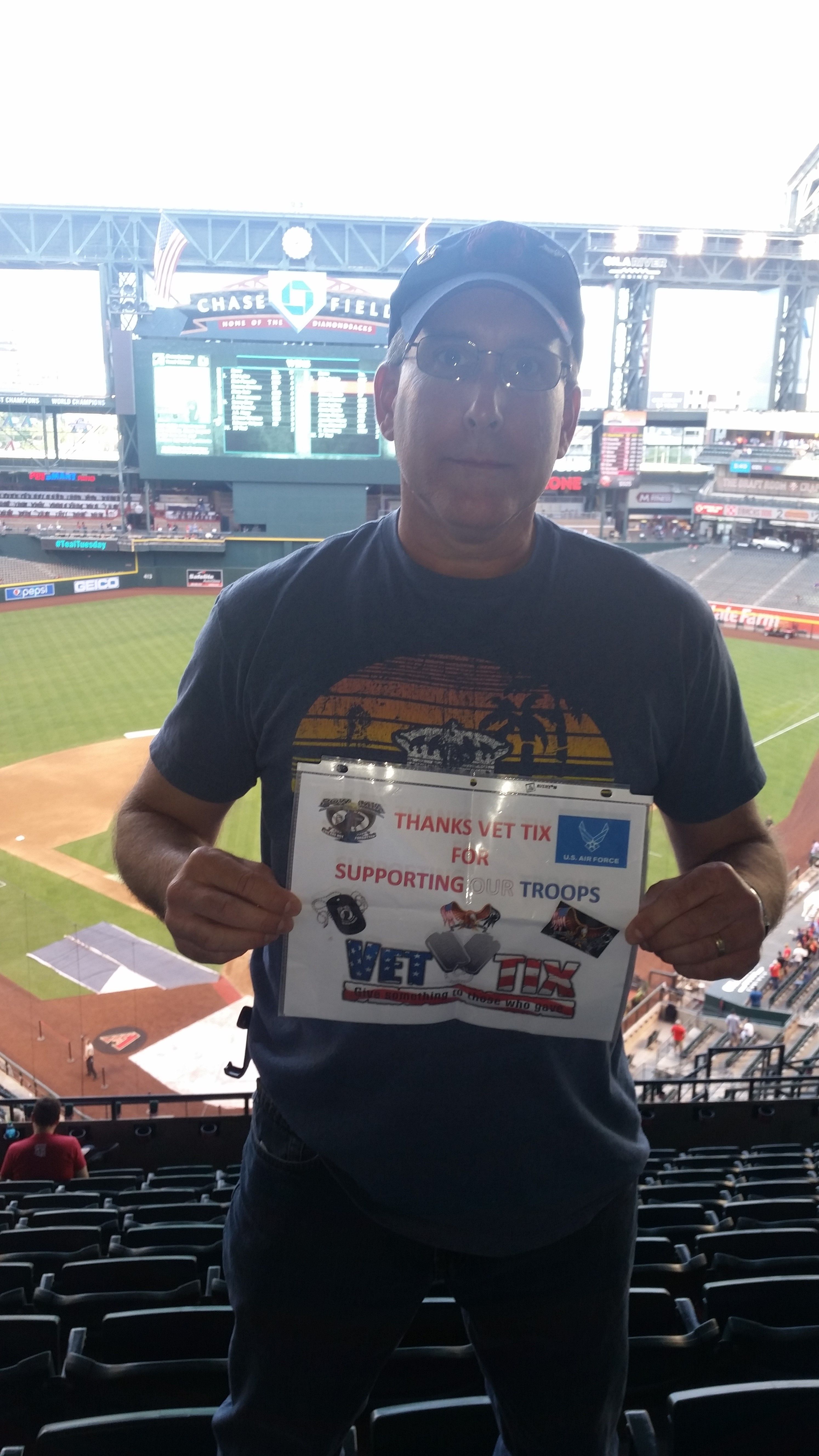 I want to thank the AZ Dbacks and individual donor or these tickets. My girl Carmen and I enjoyed an good evening with the roof top open and relaxing even tho they lost the game . So thanks again Vet Tix for doing what u do and allowing and to be able to get these tickets from your site .
