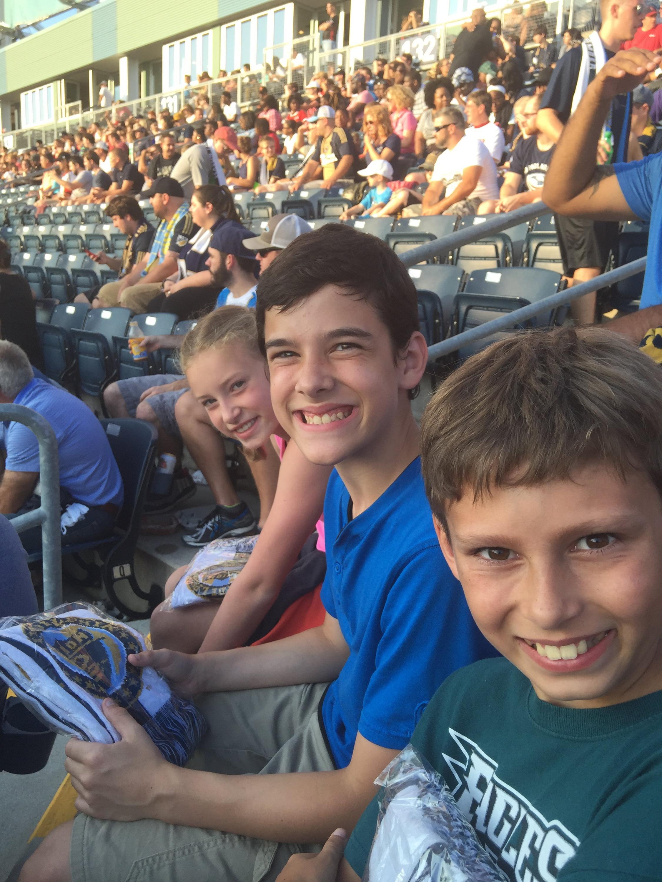 It was Military Appreciation Night at the Philadelphia Union Soccer Game vs DC United! Thank You to the Philadelphia Union, Emerald Asset Management, Coversports, RBOPrintLogistix, F.P. Woll & Company, West Point Society of Philadelphia, 1 Individual Donor, and Vettix for these tickets. It was a great event to honor all the Military Veterans present and there were fireworks after the game. Our boys had a fantastic time and enjoyed the game!