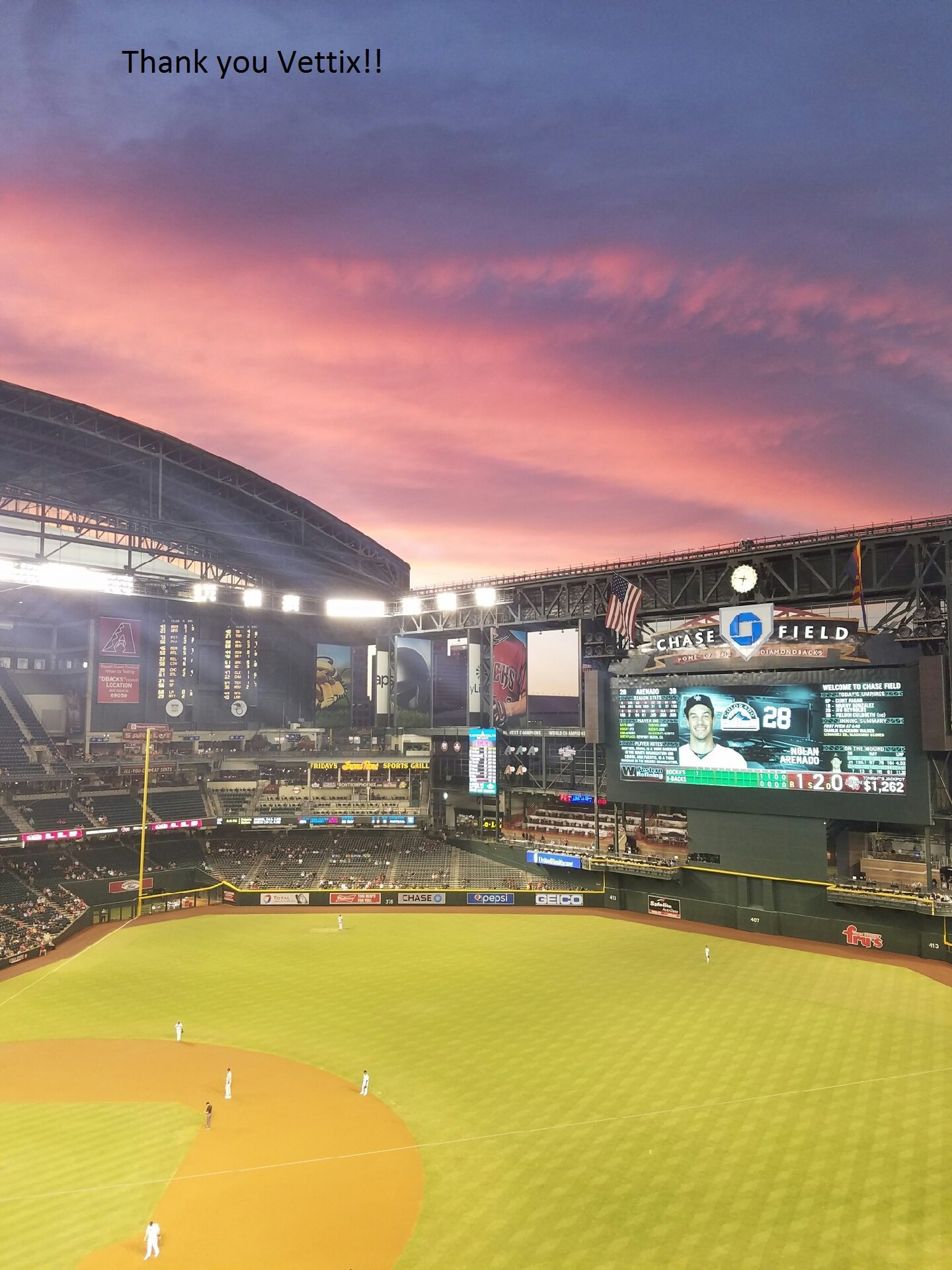We would like to thank Vettix.ord and the Arizona Diamondbacks for such a wonderful time last night at Chase field. The seats were great! My wife Tammy and mother in law Erna as well as sister in law Stacy say thanks!