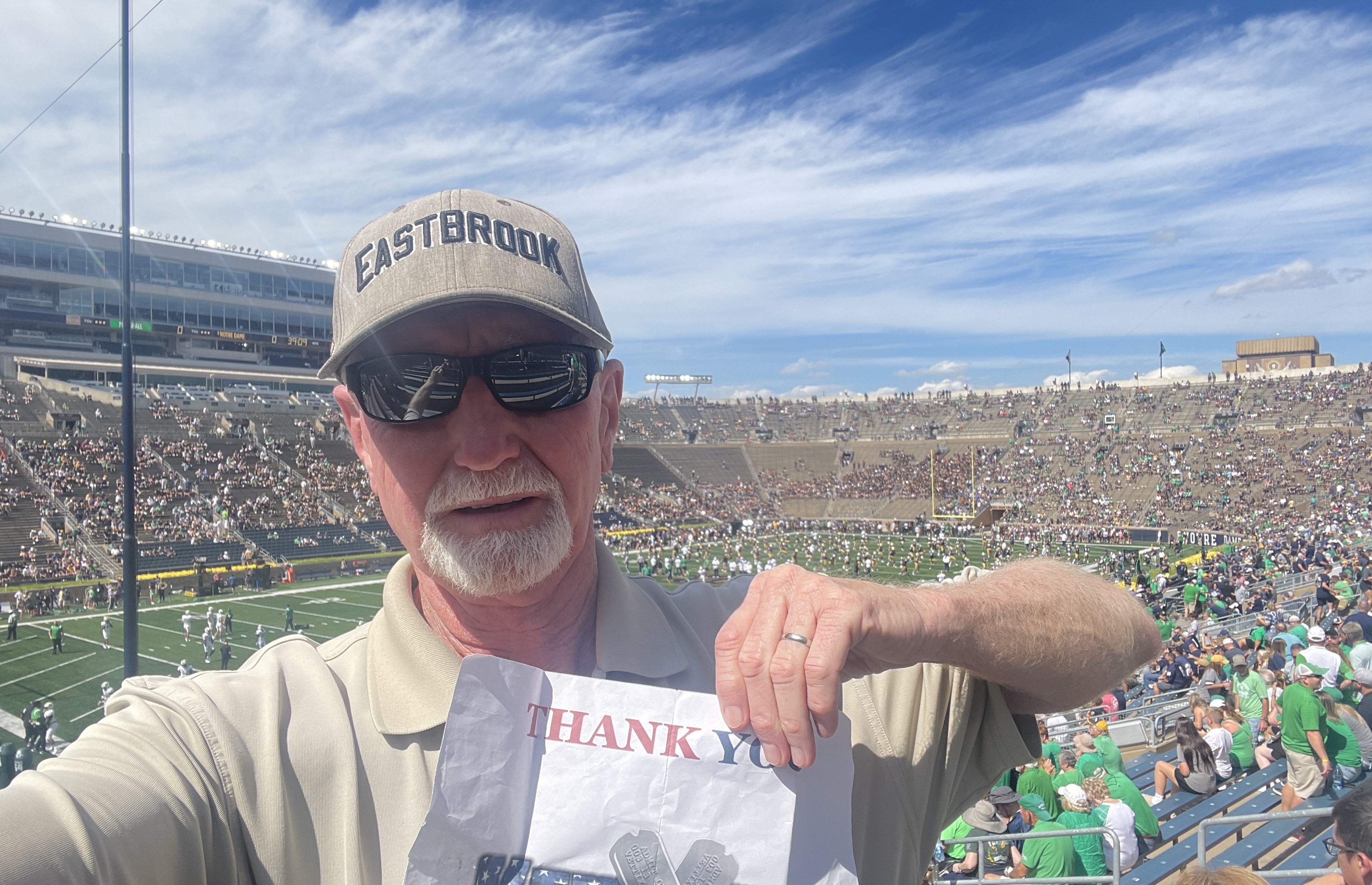 Thank you University of Notre Dame for the tickets. It means a lot to us veterans that love watching these games.