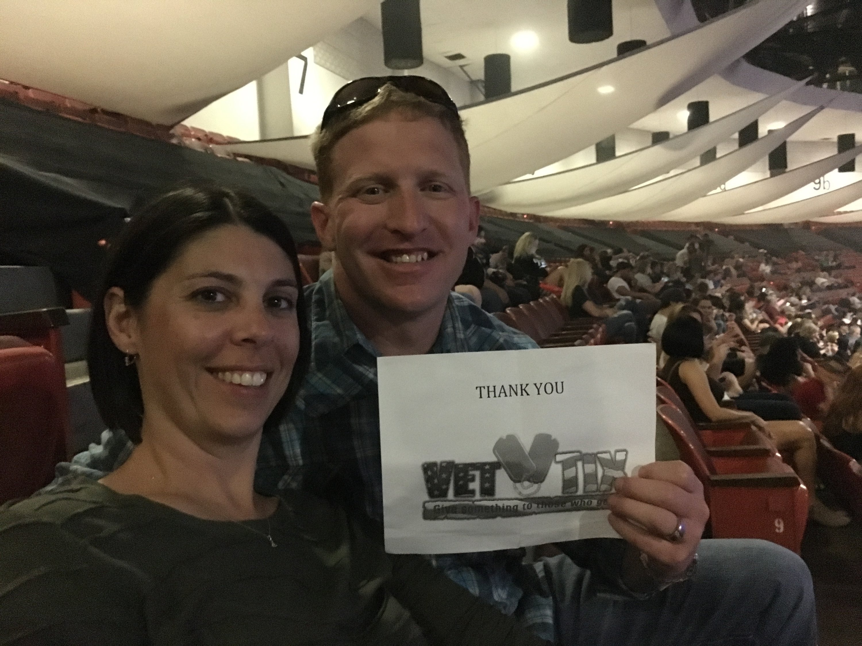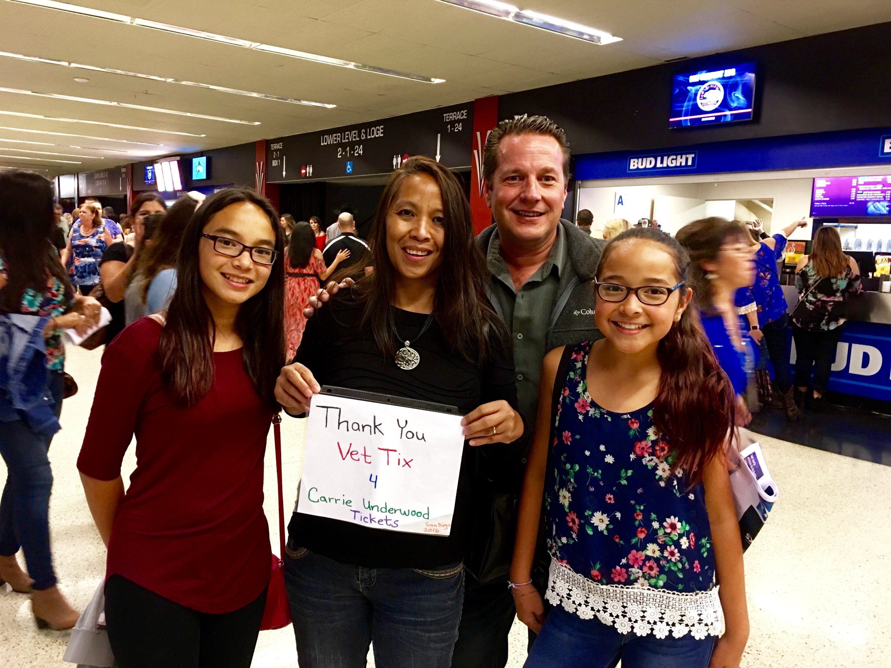 Gosh, we saw the most amazing Carrie Underwood show last Friday night in San Diego! My wife and I (20+ years of service in the USAF between us) are so very grateful to Vet Tix AND its' generous donors for all they do for our veterans. This was such a fun night out for our family. Thank you again AEG Live and Vet Tix!!!!!!!! Tim, Maria, Stephanie & Melanie McCain