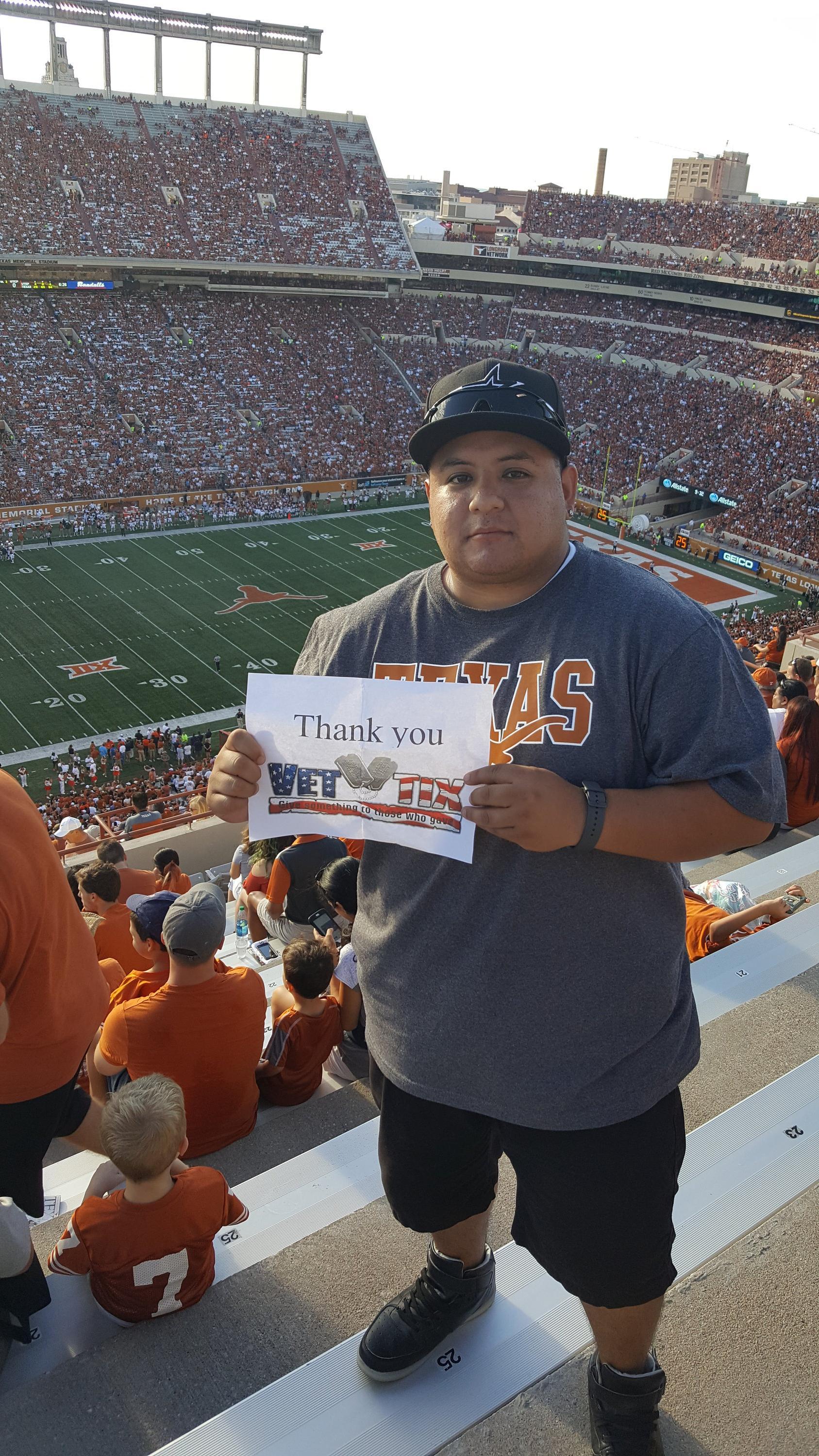 I personally want to thank UT Longhorns athletics and the individual donors who made it possible for me to support my favorite college team in person and thank you for supporting our vets. I had an amazing experience throughout the entire event. Chris B. U.S. Army reserve '04-'12