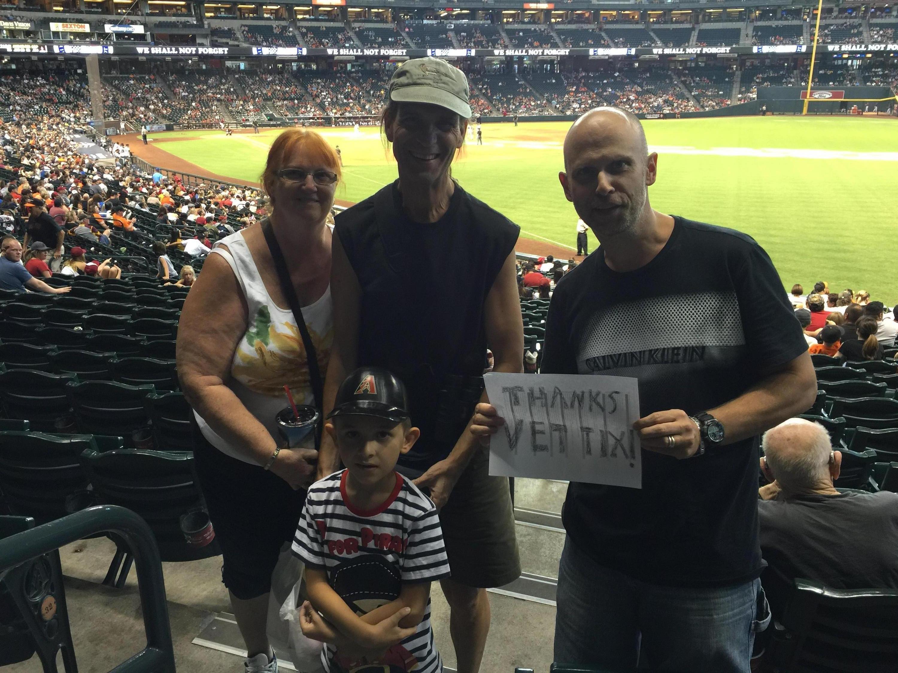 Thank you UnitedHealhtcare Military & Veterans, Arizona Diamondbacks MLB and APS for these tickets. They were really good seats and we had a good time although the Dbacks didn't win thank you and much appreciated to Vet Tix as well for what you do for Veterans