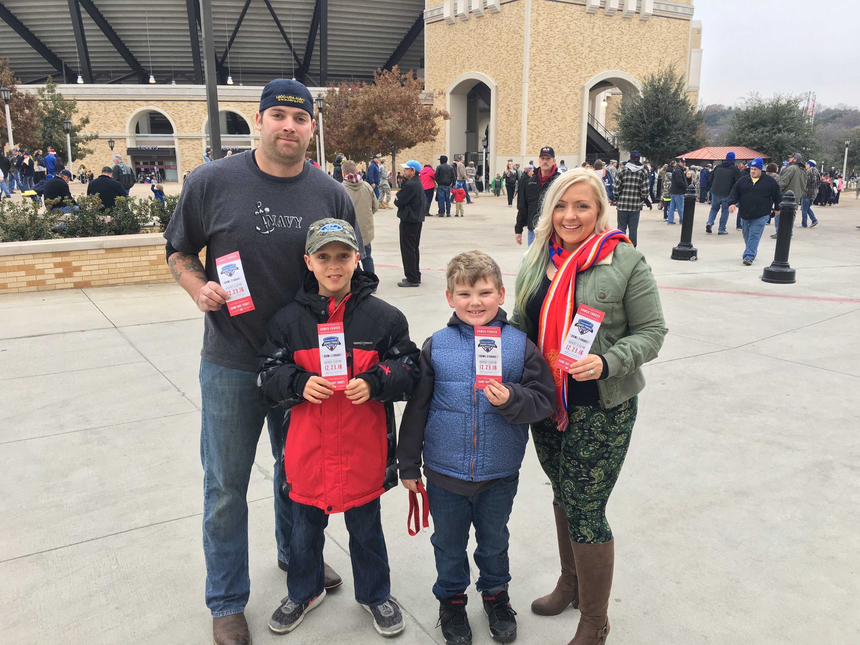 Our family had a wonderful time at the Armed Forces bowl. My husband and I are dual military and really appreciated being able to go, with 4 people, these things can get expensive so not having to budget for tickets allowed us to be able to enjoy the concessions and buy a souvenir. The tailgate party was incredibly fun, the boys had a blast interacting w the service members and participating in the activities. The seats we scored were perfect! We had a really great time. Thank you so much!!
