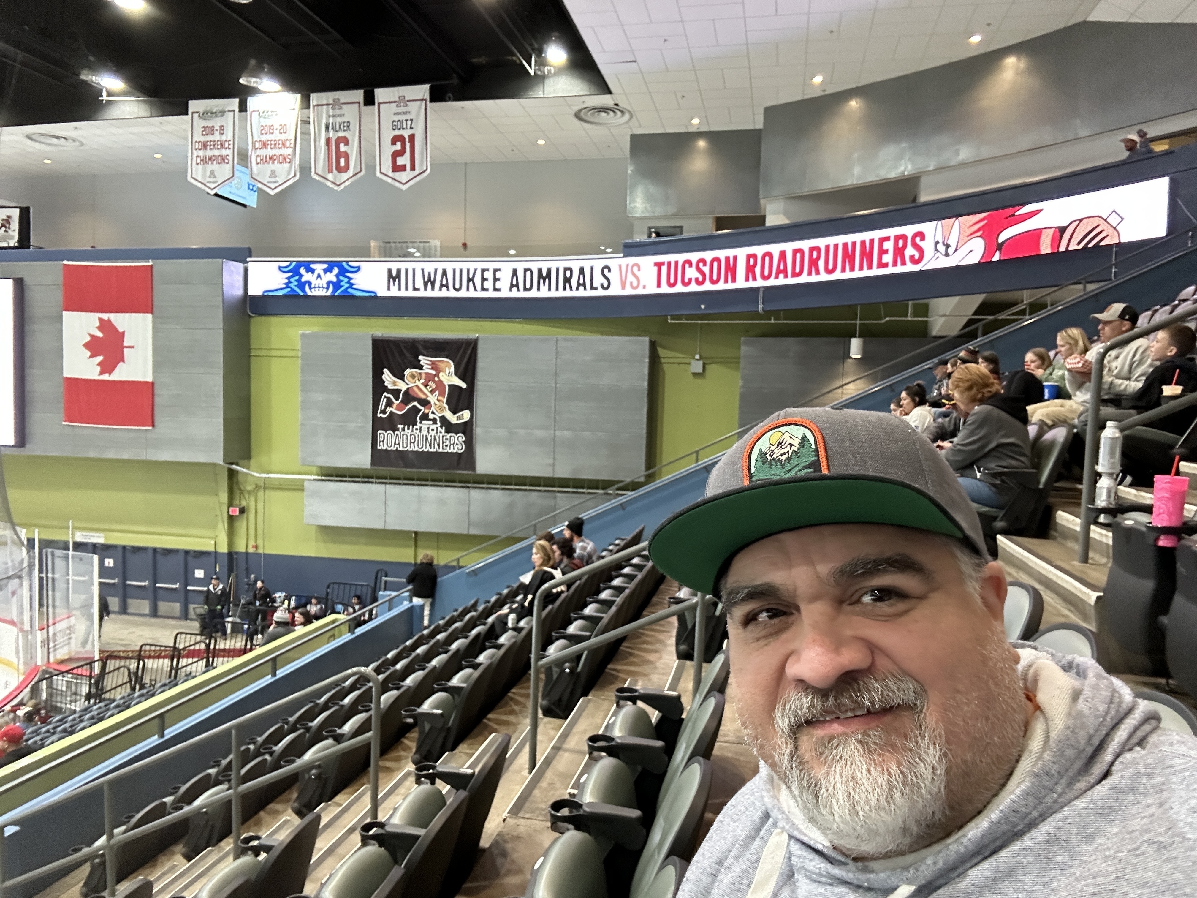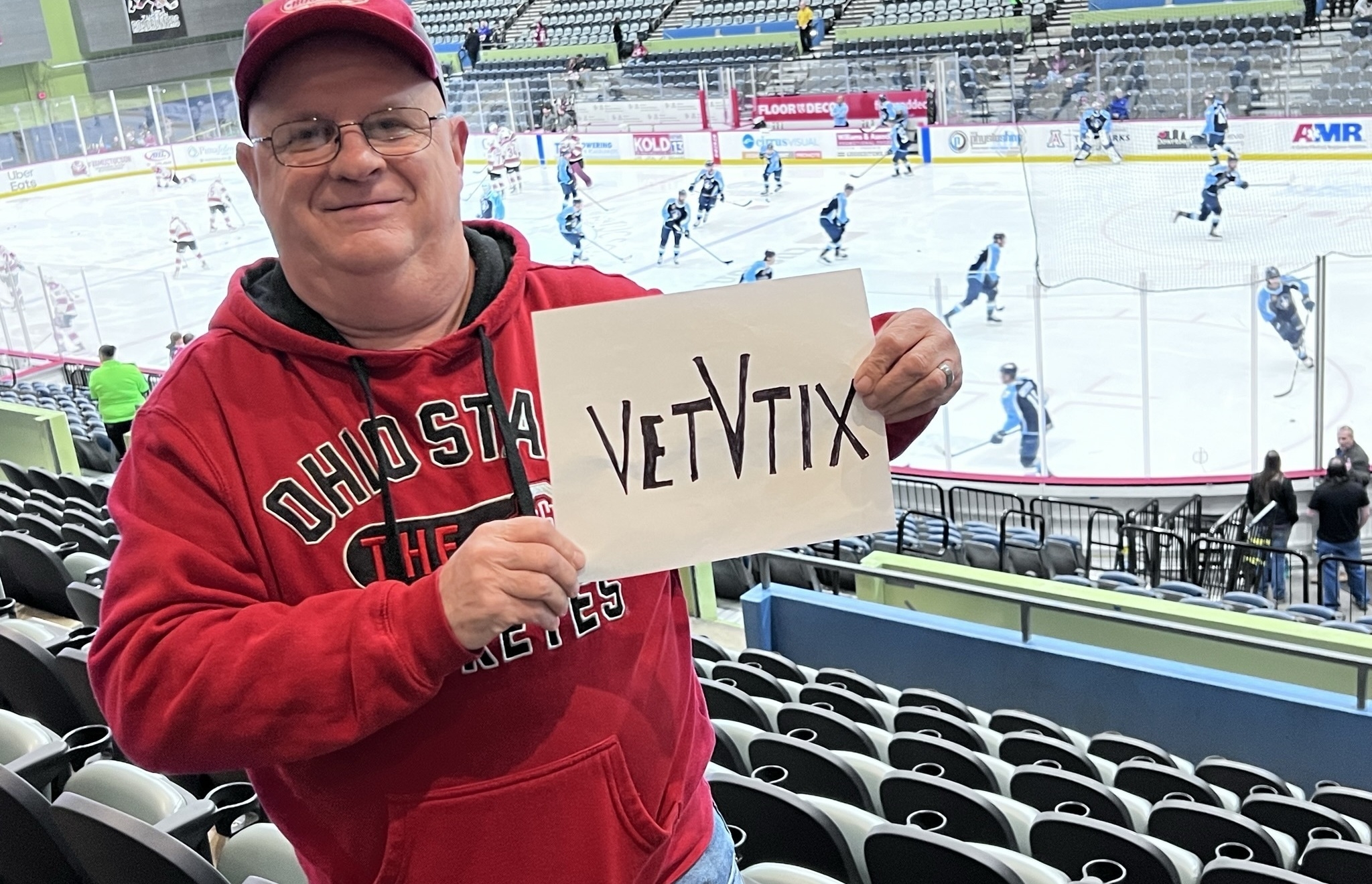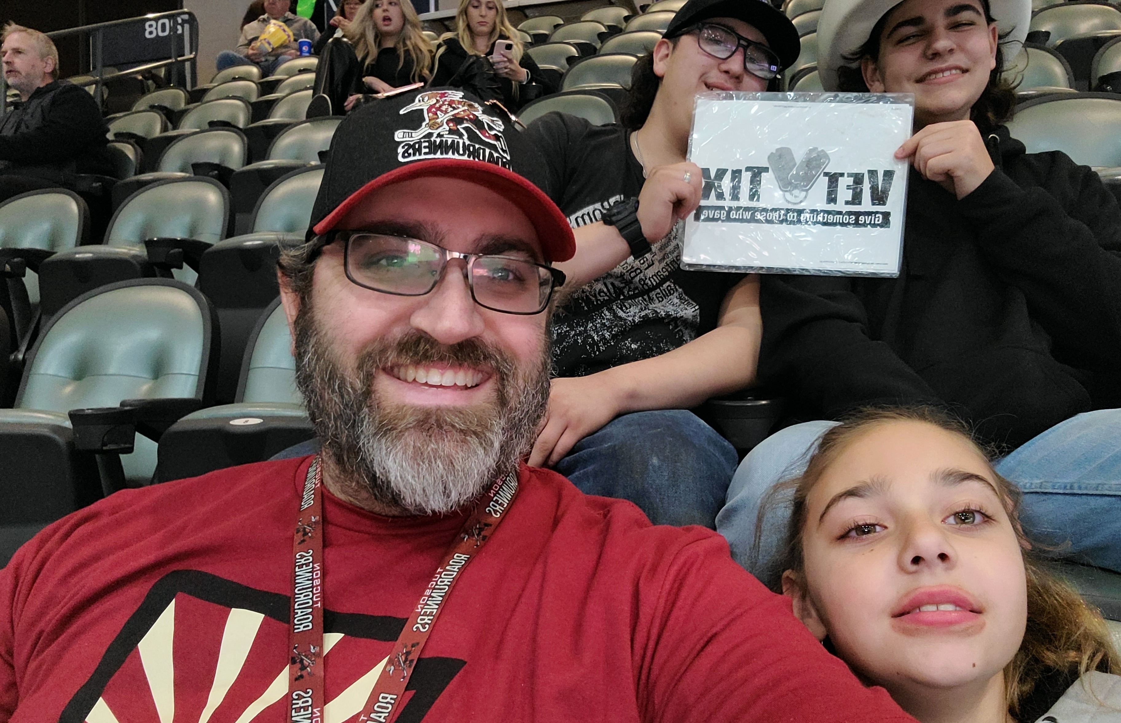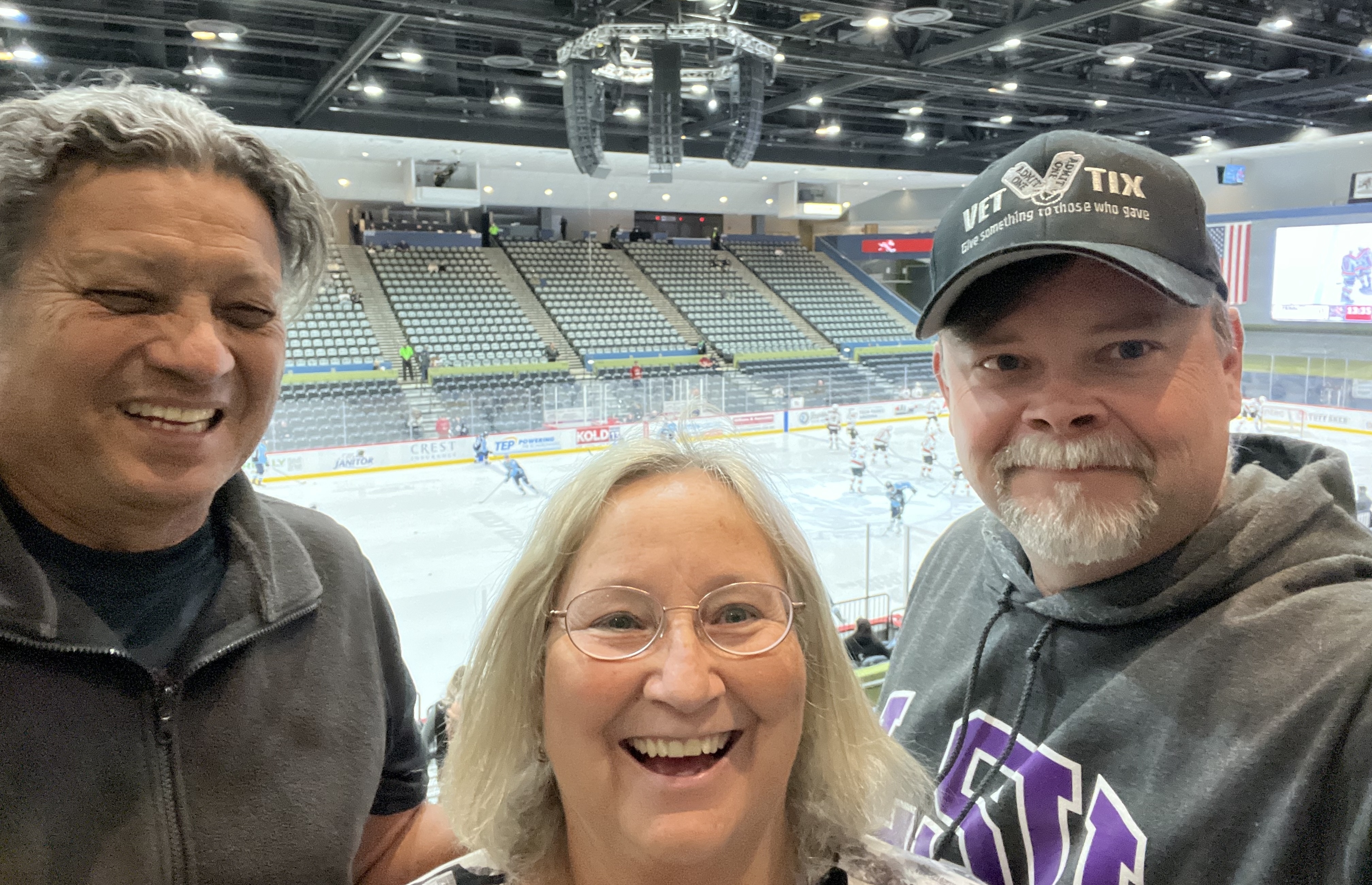 Thank you Tucson Roadrunners and VetTix. We had a wonderful time at the hockey game. This was my guest's first time at a hockey game. I'm wearing a VetTix hat at an event.