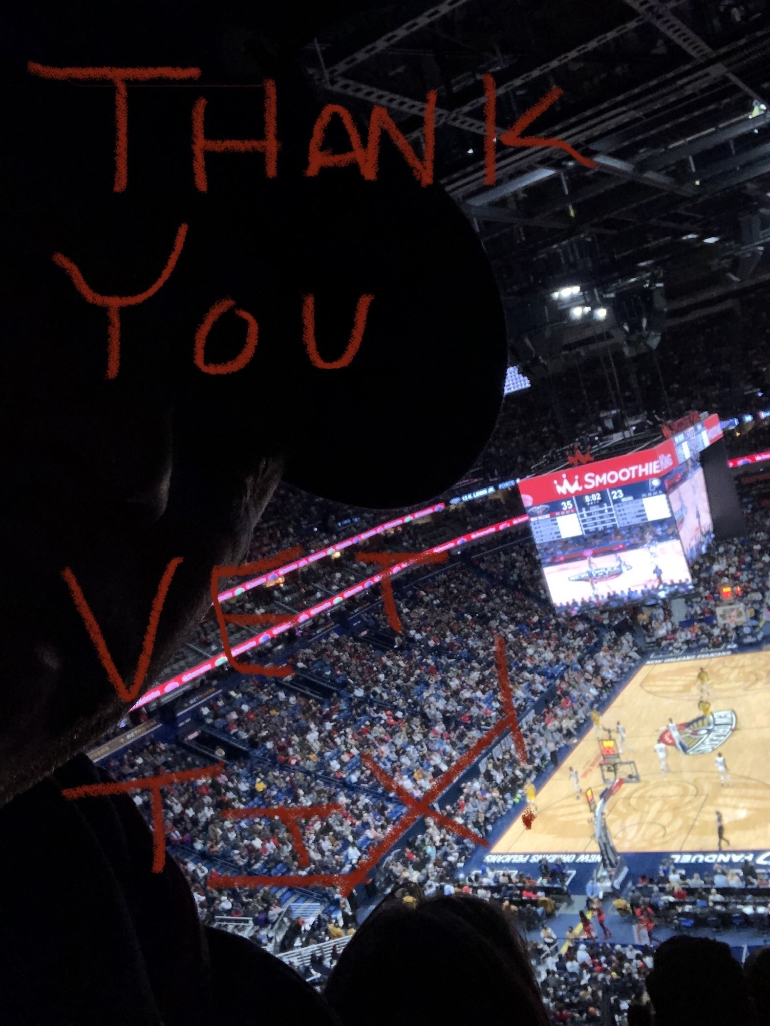 The Scott Family would like to thank the Veteran Tickets Foundation along with the New Orleans Pelicans for the NBA tickets last night. Great night with a great win. We had a wonderful night.