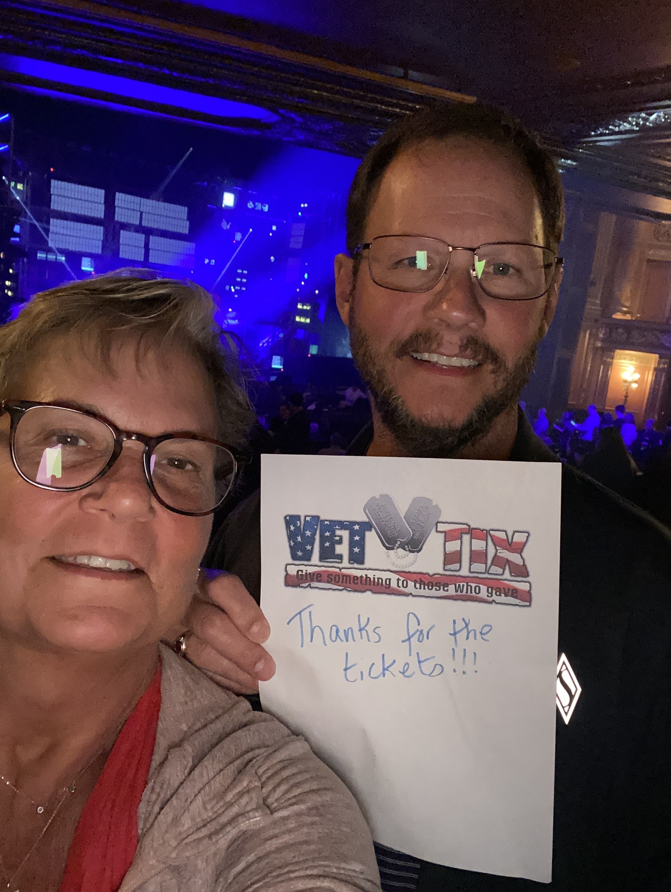 Thanks for the tickets! We had a blast! One of our favorite performances! Thank you for all you do to support military veterans! It means a lot to be remembered after we leave the service.