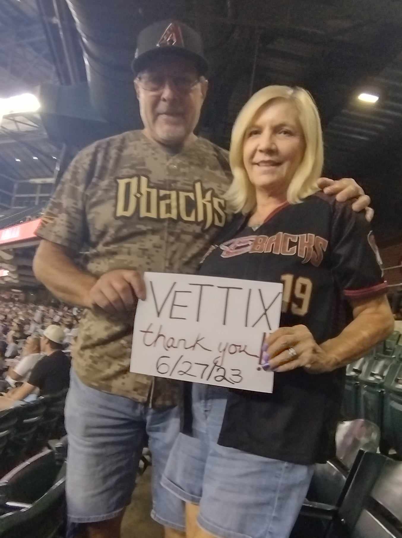 Az DBacks, Thank you for your continued support for Veterans thru VetTix! I appreciate the opportunity to see my Favorite Team with my friends n family! K