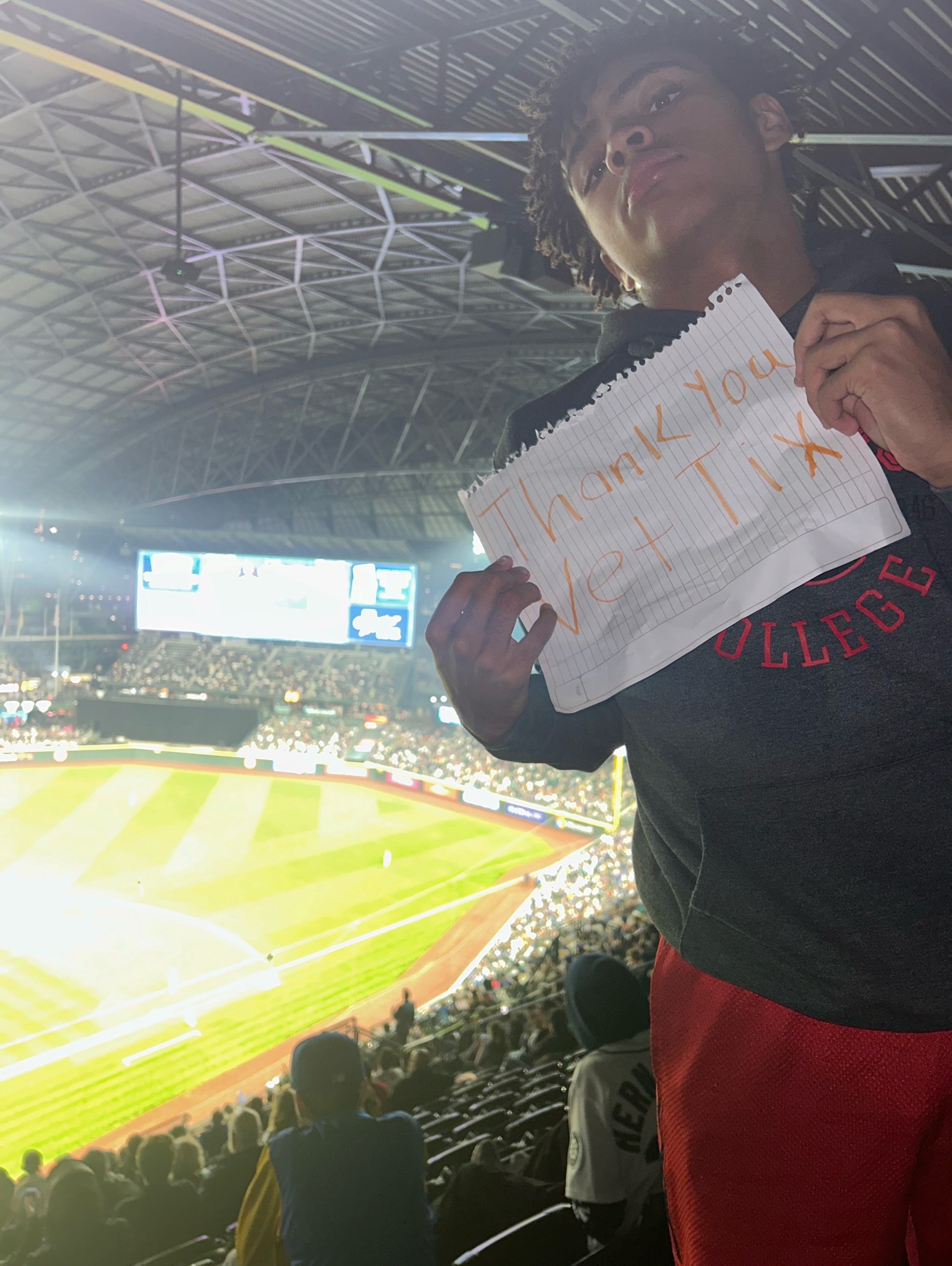 I wanted to express my heartfelt gratitude for the incredible opportunity you provided my family by giving us tickets to attend the Mariners vs. Astros game. Your generosity has allowed us to create lasting memories and share a special experience together. We are truly thankful for your support and the wonderful work you do for veterans and their families.