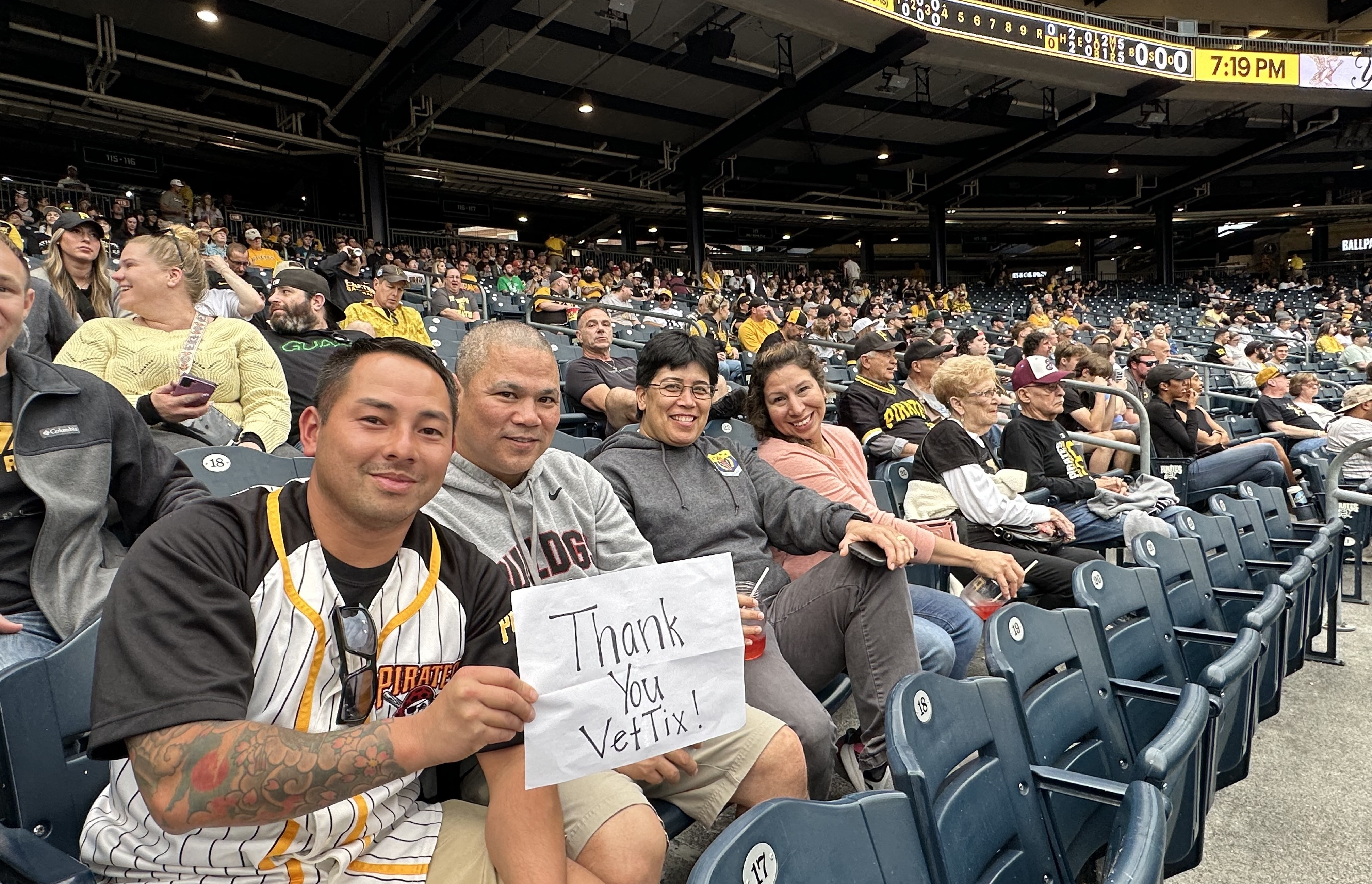 Thank you to the Pittsburgh Pirates and Vet-Tix for the great seats at the Pirate vc Rockies game last night. Had a great time and the Pirates got the victory. Always special to get to see the Pirates in person. Thank you.