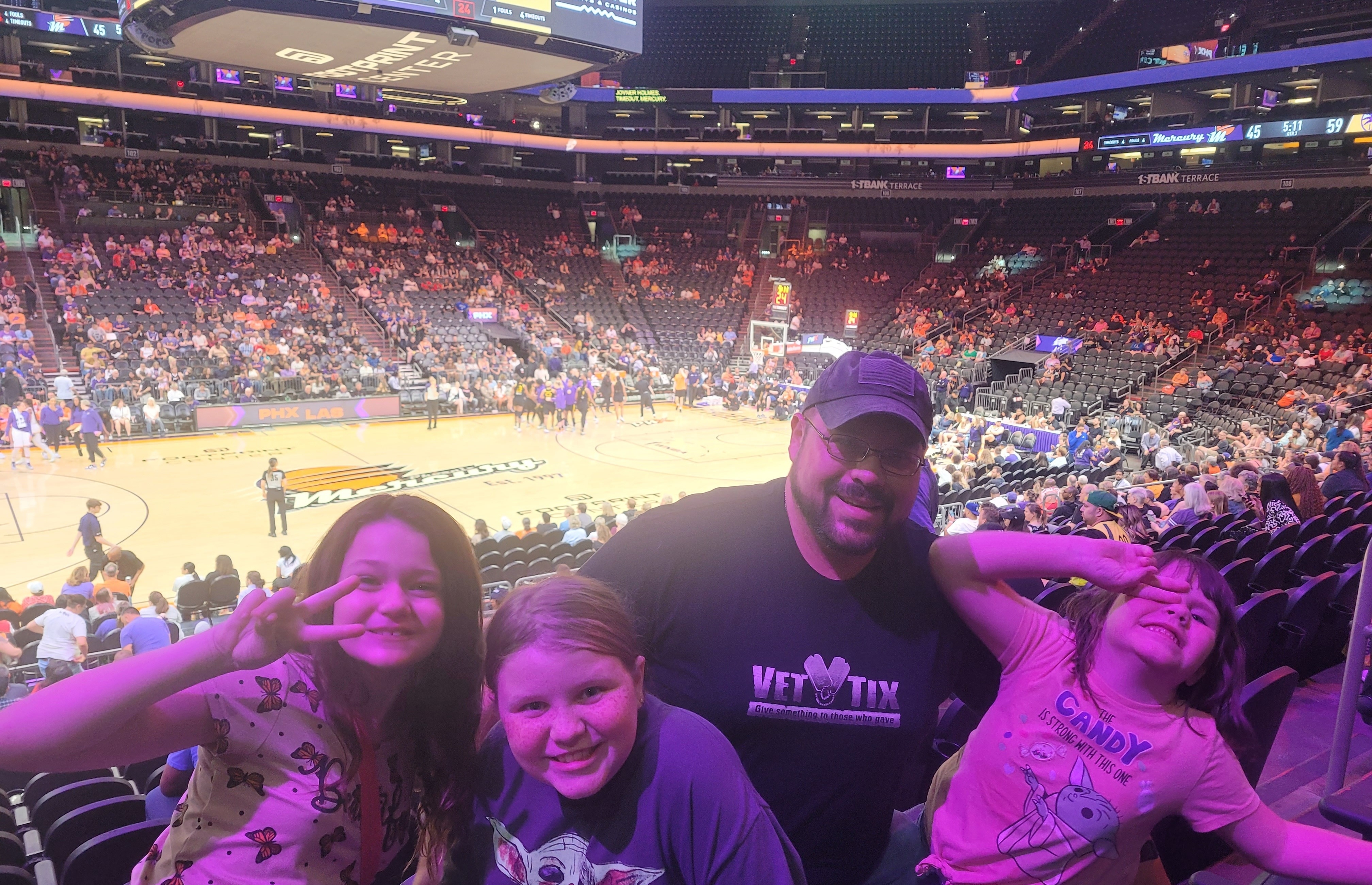 Thank you so much to the Phoenix Mercury for donating some super seats for the game Friday night. We got to see the Mercury team up close and be able to pick out the players. My husband a retired Veteran from 1972, with Limited Vision was able to see what was going on and enjoyed the game. Only better thing would have been if the women had shot baskets a bit truer. We so enjoyed the game and appreciate your involvement with Veterans by donating tickets to VetTix.
