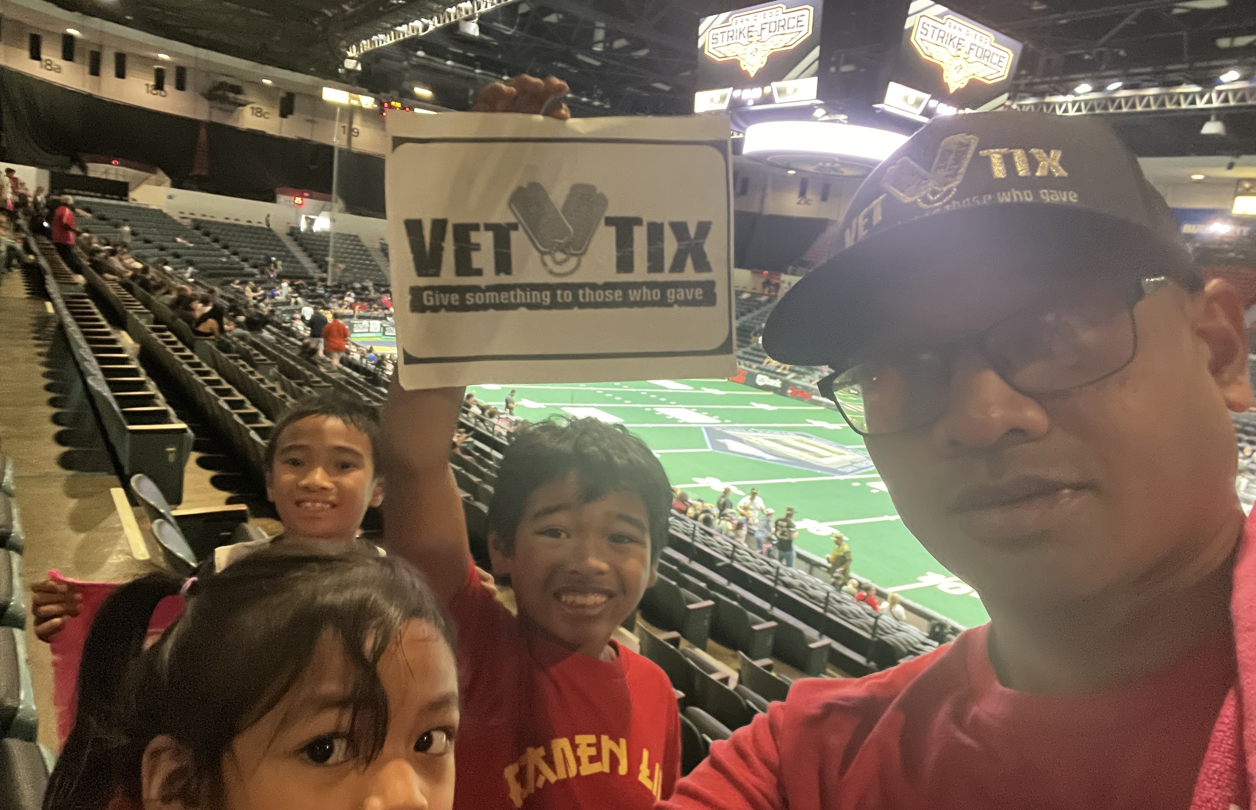 Dear San Diego Strike Force, Thank you for the great tickets and supporting VETERANS. As advertised the indoor game is rapid pace and exciting. The young people pounding the rails in the west end zone really got a workout and inspired the crowd all night. A great win for the Strike Force to end the season on a high note. Thanks again!!! David