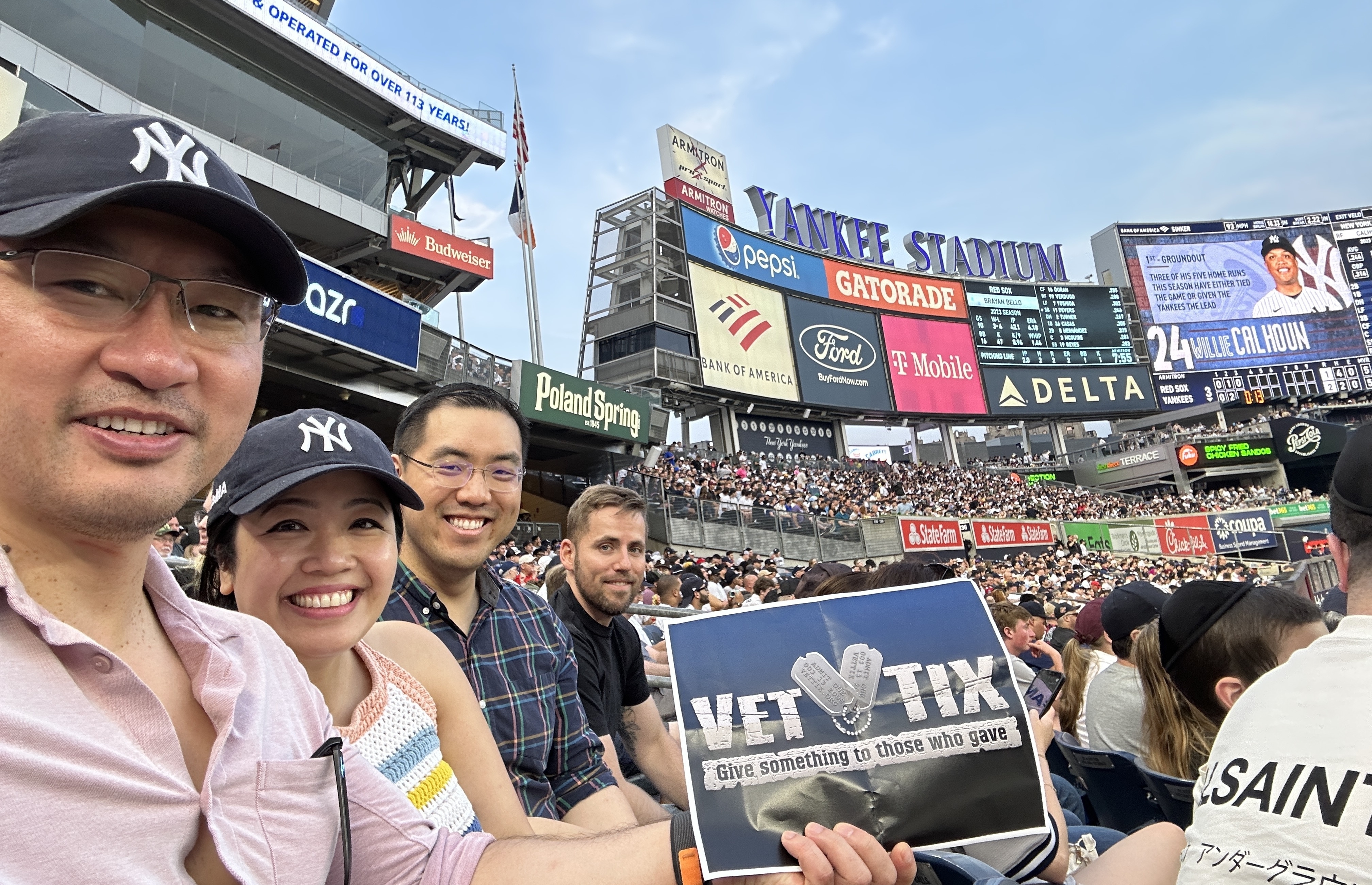 Thank you New York Yankees for excellent seats and a chance to see an exciting baseball game between the New York Yankees and our perennial rivals the Boston Red Sox. We enjoyed the game and even got to get to extra innings. Unfortunately not the outcome that we wanted as the Yankees lost in the 10th but still a great game. Great times thank you for giving back to veterans.