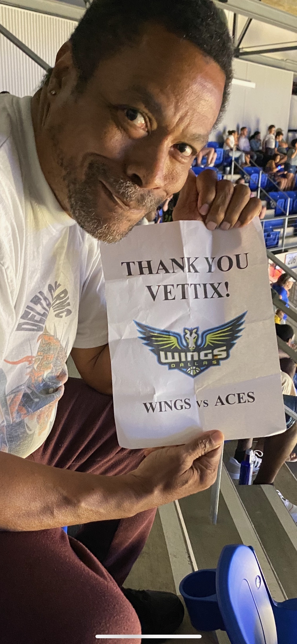 I would like to Thank Vet Tix and the Dallas Wings for the opportunity to share a memorable moment with my mom and friend. This is a moment I would not have been able to attend without the assistance of Vet Tix and the Dallas Wings. It is Greatly Appreciated, Thanks Kindly.
