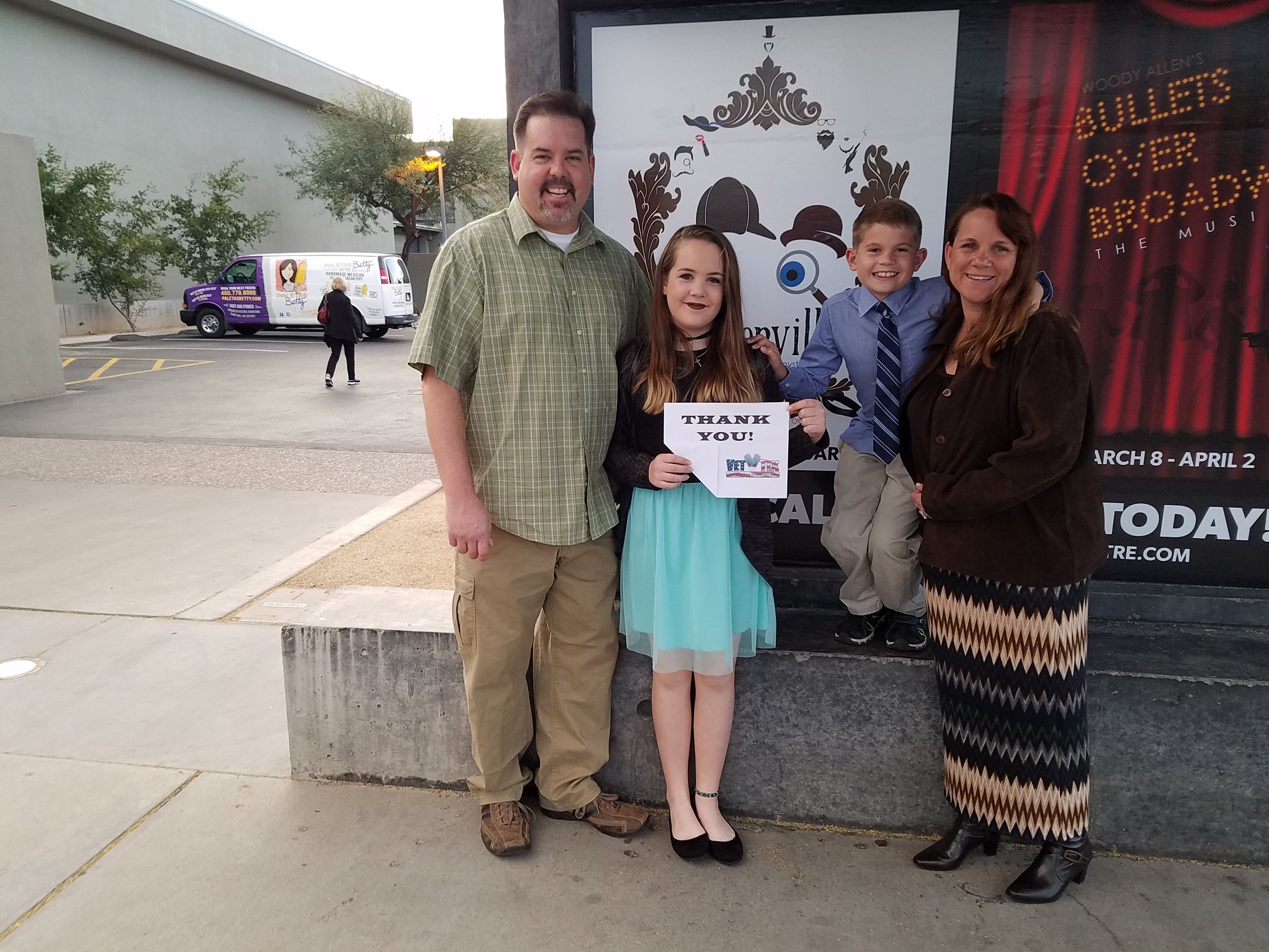 Thank You very much for the tickets to see Sherlock Holmes at the Phoenix Theatre. My family and I enjoyed the performance very much. It was our first time there and we thought it was amazing! Thank you again for generosity to all the Vets here in Phoenix.