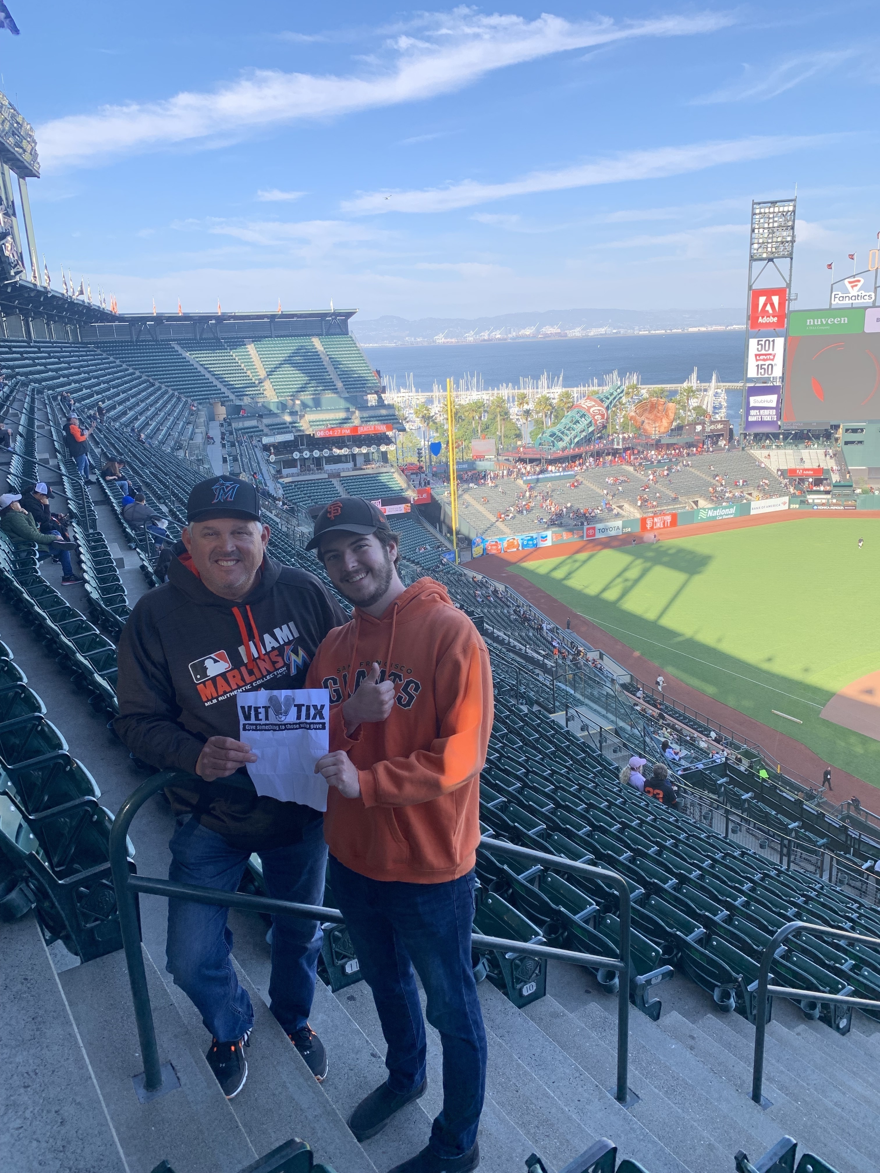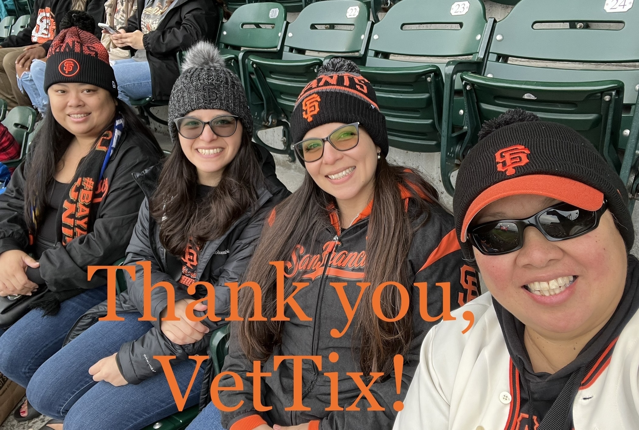Thank you SF Giants for supporting veterans. It was great to take friends and neighbors out for an event that we've never experienced before. We had so much fun cheering and watching the crowd go wile. Now we're Giants fans, and we would love to attend more games in the future.